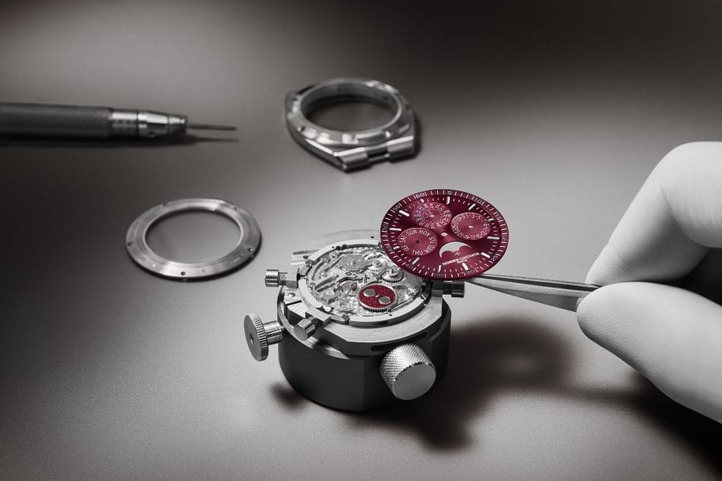 - Cadran laqué bordeaux, finition satinée soleil, minuterie veloutée, compteurs colimaçonnés