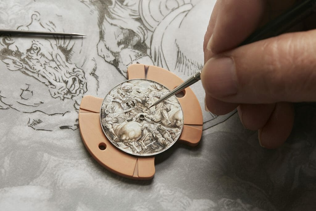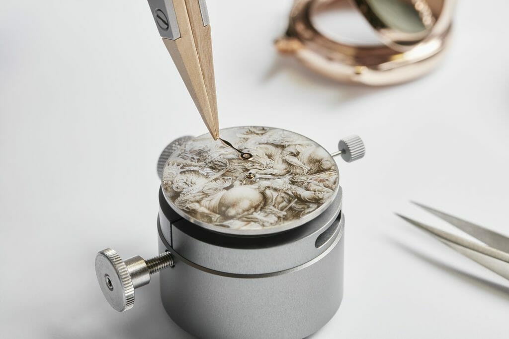 «Retranscrire sur un cadran de 3,3cm de diamètre un dessin fait de traits à l’encre et à la plume représente un réel défi. Il faut rentrer dans l’œuvre et se l’approprier pour retrouver le niveau de détails en conservant la force du graphisme » précise le Maître émailleur de Vacheron Constantin.