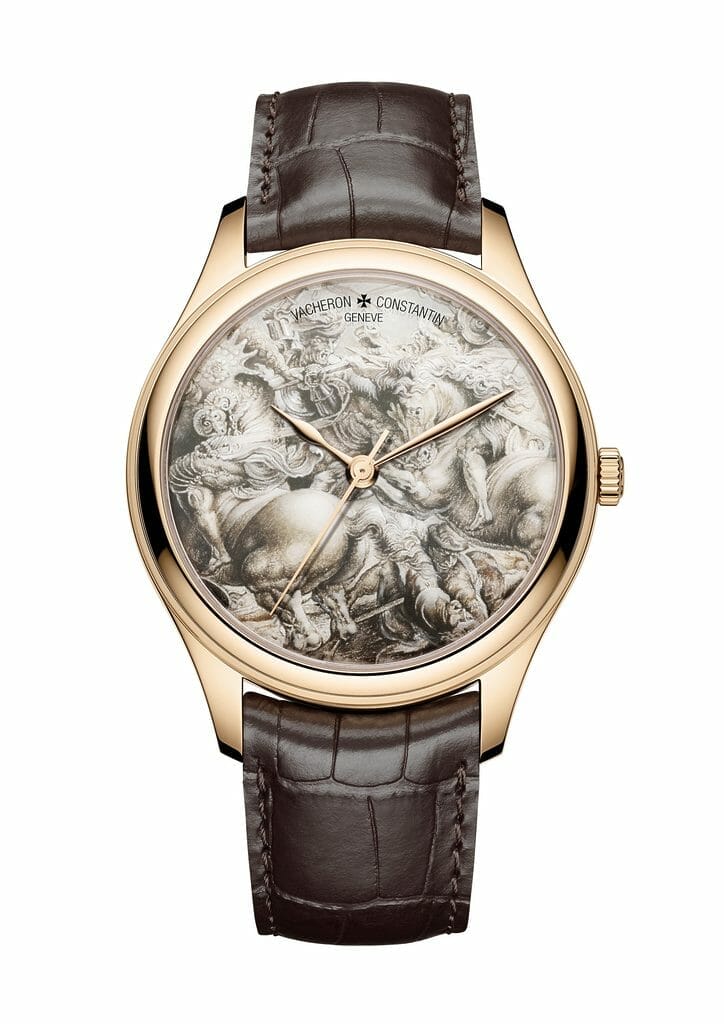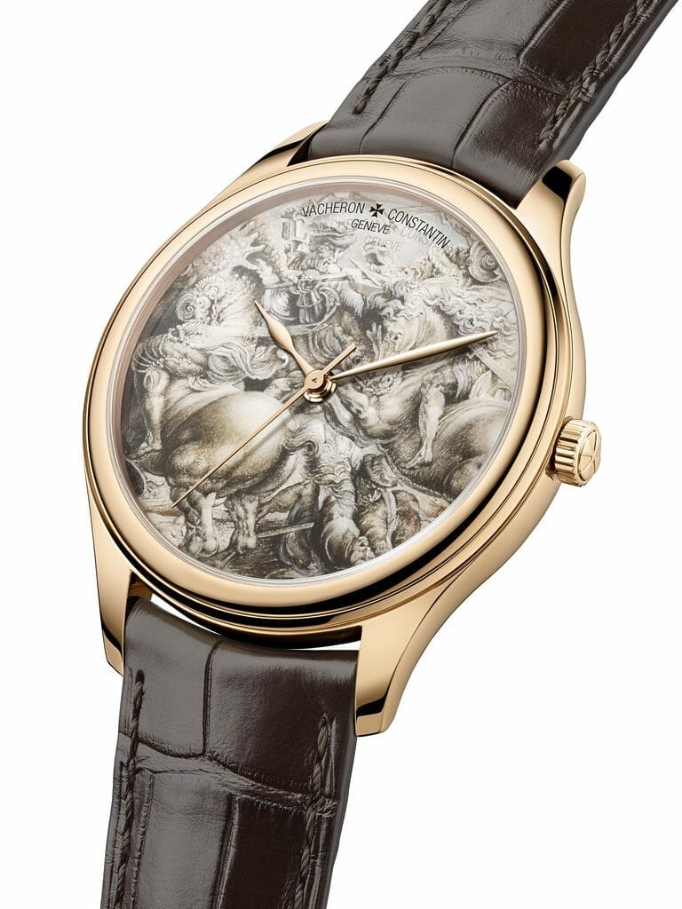 En décembre 2020, Vacheron Constantin a participé à la vente aux enchères destinée à soutenir un vaste projet d’ateliers éducatifs du Louvre, 100% des gains étant reversés pour soutenir Le Studio, un lieu de découvertes et d’échanges ouvert à tous pour s’approprier le musée, ses collections et ses métiers avec notamment une initiation aux techniques des arts plastiques. Dans cet esprit, Vacheron Constantin a proposé une expérience unique, incarnée par une montre Les Cabinotiers à exemplaire unique dont le cadran devait être personnalisé avec la reproduction en émail miniature ou en émail grisaille d’une œuvre conservée au Louvre et choisie par l’acquéreur. Guidé par des experts du musée, l’acquéreur a également eu le privilège d’une visite privée du musée et du Cabinet des dessins, un lieu accessible au public uniquement sur réservation, afin de déterminer l’œuvre à reproduire. C’est là qu’est conservé le dessin original finalement élu, La lutte pour l’étendard de la Bataille d’Anghiari, de Pierre Paul Rubens.