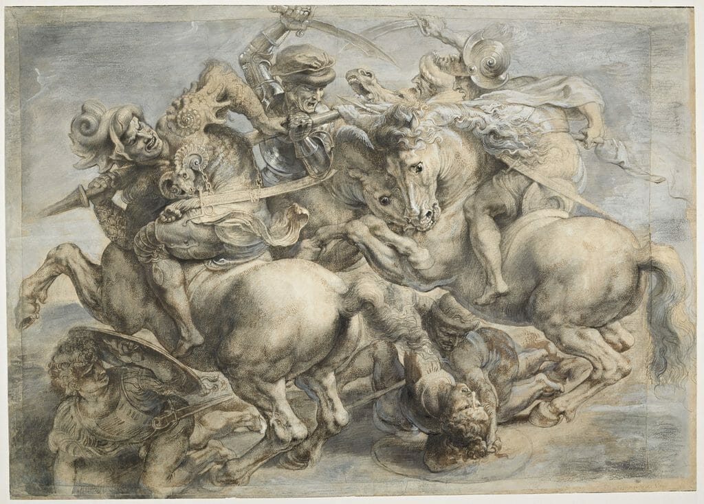 Le dessin de Pierre Paul Rubens a une histoire extraordinaire. Lors de son séjour en Italie, au début du XVIIe siècle, le peintre flamand aurait acheté, puis retouché à l’encre, au lavis et à la gouache, cette feuille représentant la Bataille d’Anghiari, vaste composition commandée à Léonard de Vinci pour la salle du Grand Conseil du Palais de la Seigneurie – par la suite devenu Palazzo Vecchio – à Florence. Considérée comme l’un des grands chefs d’œuvre de l’artiste, l’immense peinture, qui célébrait une fameuse victoire des armées du pape Eugène IV et des républiques de Venise et de Florence sur celles du duc de Milan, laissée inachevée par Léonard en 1506, se dégrada très rapidement. Il n’en restait pratiquement rien lorsque Giorgio Vasari, au milieu du XVIe siècle, restructura la salle à la demande du duc Cosimo I, pour en faire l’actuel Salone de’ Cinquecento, et recouvrit les murs d’un nouveau décor exaltant les hauts faits de la maison des Médicis. Les vestiges de la Bataille d’Anghiari auraient-ils été conservés sous les fresques de Vasari ? Personne, à ce jour, n’en a apporté la preuve, et les essais de recherches, notamment sous la Bataille de Marciano, se sont révélés tout à fait infructueux.