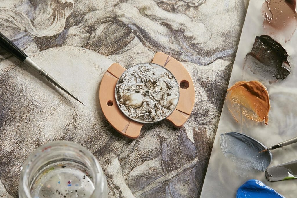 Adjugée lors de la vente « Bid for the Louvre » organisée au profit des projets solidaires du musée en décembre 2020, une montre personnalisable Les Cabinotiers a initié une nouvelle offre, « Un chef d’œuvre au poignet ». Après deux années riches en découvertes incluant, pour l’acquéreur, une visite privée du musée et de la manufacture afin d’échanger avec les experts du Louvre et les Maîtres artisans de la Maison, l’aventure a donné naissance à une montre à exemplaire unique : Les Cabinotiers – Hommage à Pierre Paul Rubens, La lutte pour l’étendard de la Bataille d’Anghiari. Son cadran en émail miniature reproduisant de manière fidèle le dessin éponyme de Pierre Paul Rubens.