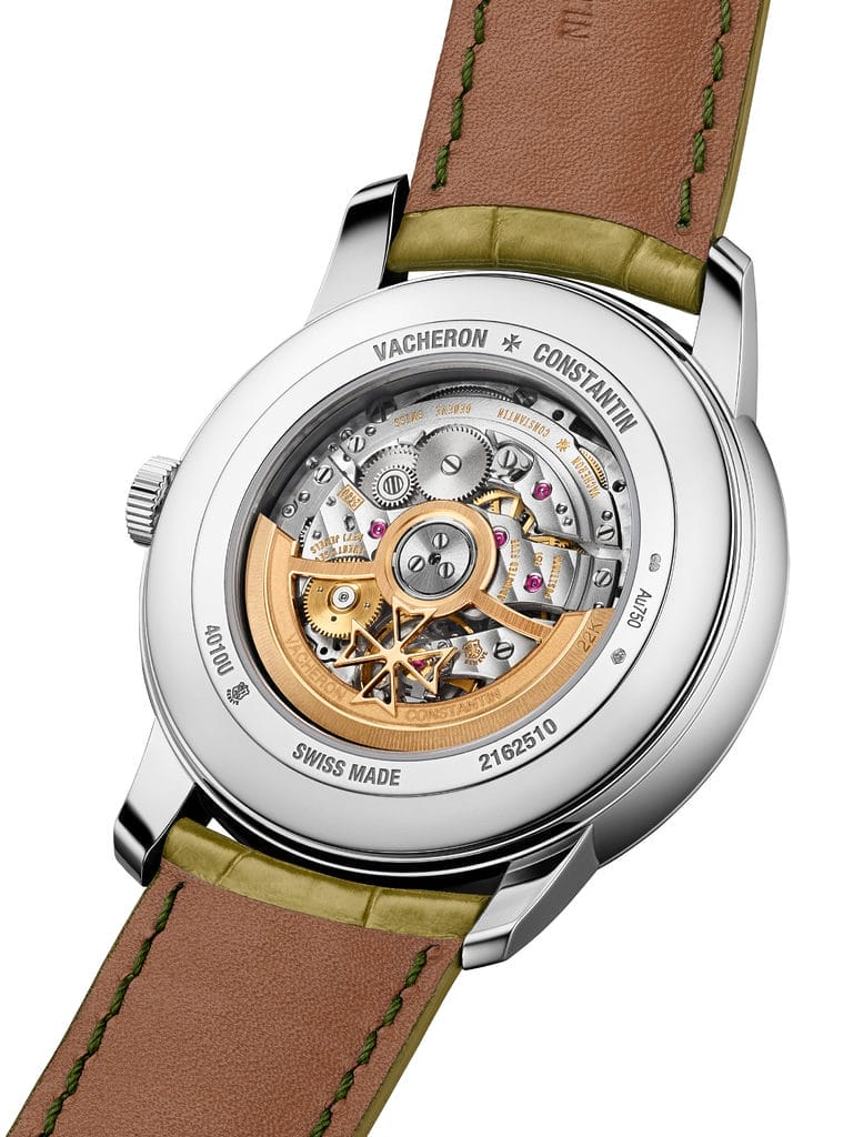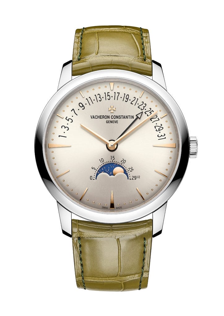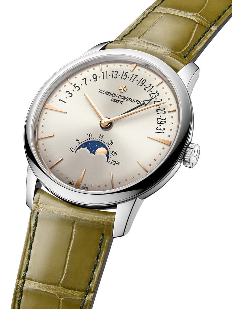 Élégante, épurée, harmonieuse, la montre Patrimony phase de lune date rétrograde adopte elle aussi une nouvelle dynamique et se pose au poignet avec une touche de couleur inédite grâce au nouveau bracelet en cuir d’alligator vert olive.