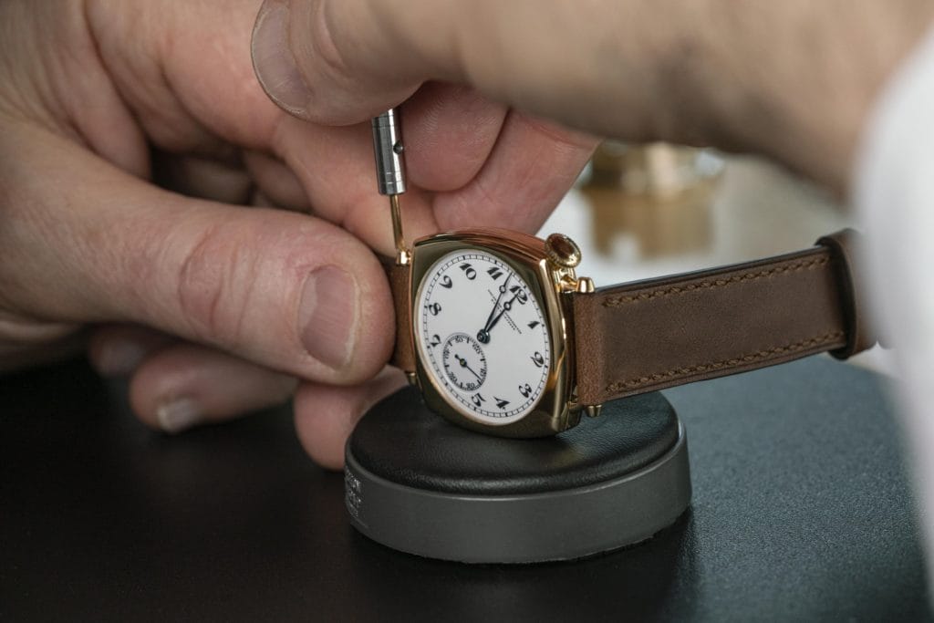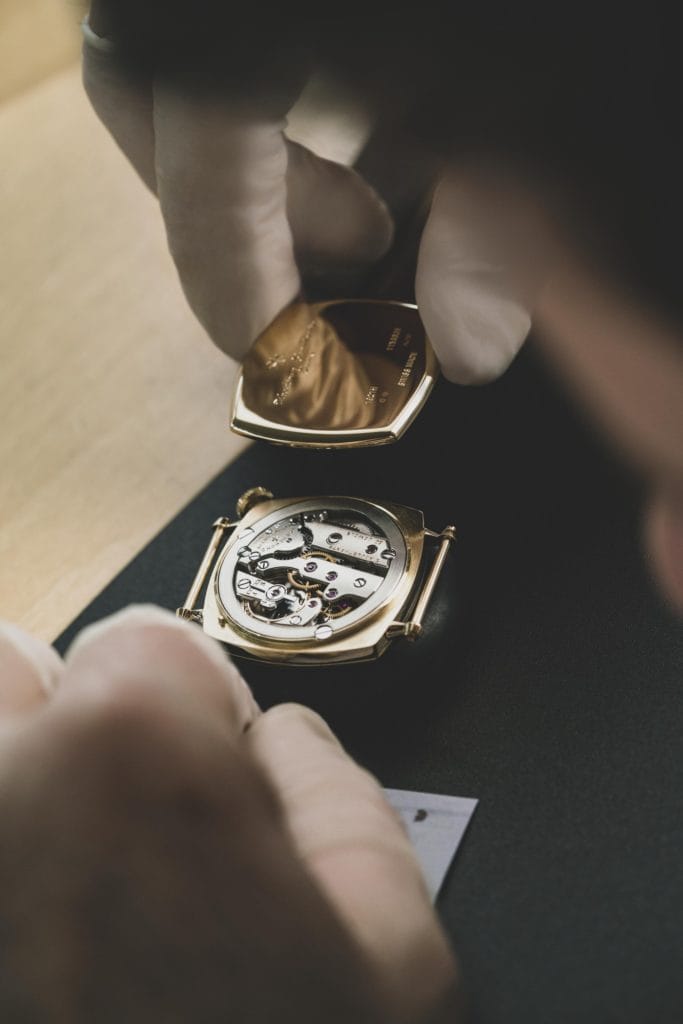 Certains composants d’époque étaient disponibles dans les stocks de l’atelier Restauration, telles la couronne et les aiguilles à l’état d’ébauche. D’autres ont dû être intégralement recréés. A commencer par le boîtier de 31,5 mm, selon les dimensions de l’American 1921 originelle. Il a été façonné par un orfèvre de l’atelier Restauration dans l’alliage d’or spécifique du modèle historique (or jaune 18K 3N), identifié à l’aide d’un spectromètre afin d’en reproduire la teinte exacte. Seule une gravure laser appliquée sur le fond du boîtier, pour des raisons douanières, distingue l’American 1921 Pièce unique de son aïeule.