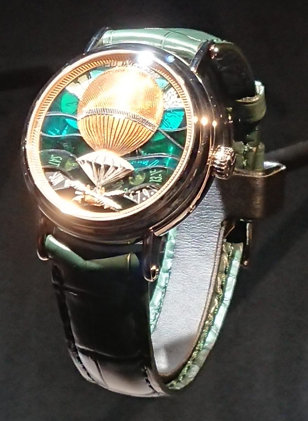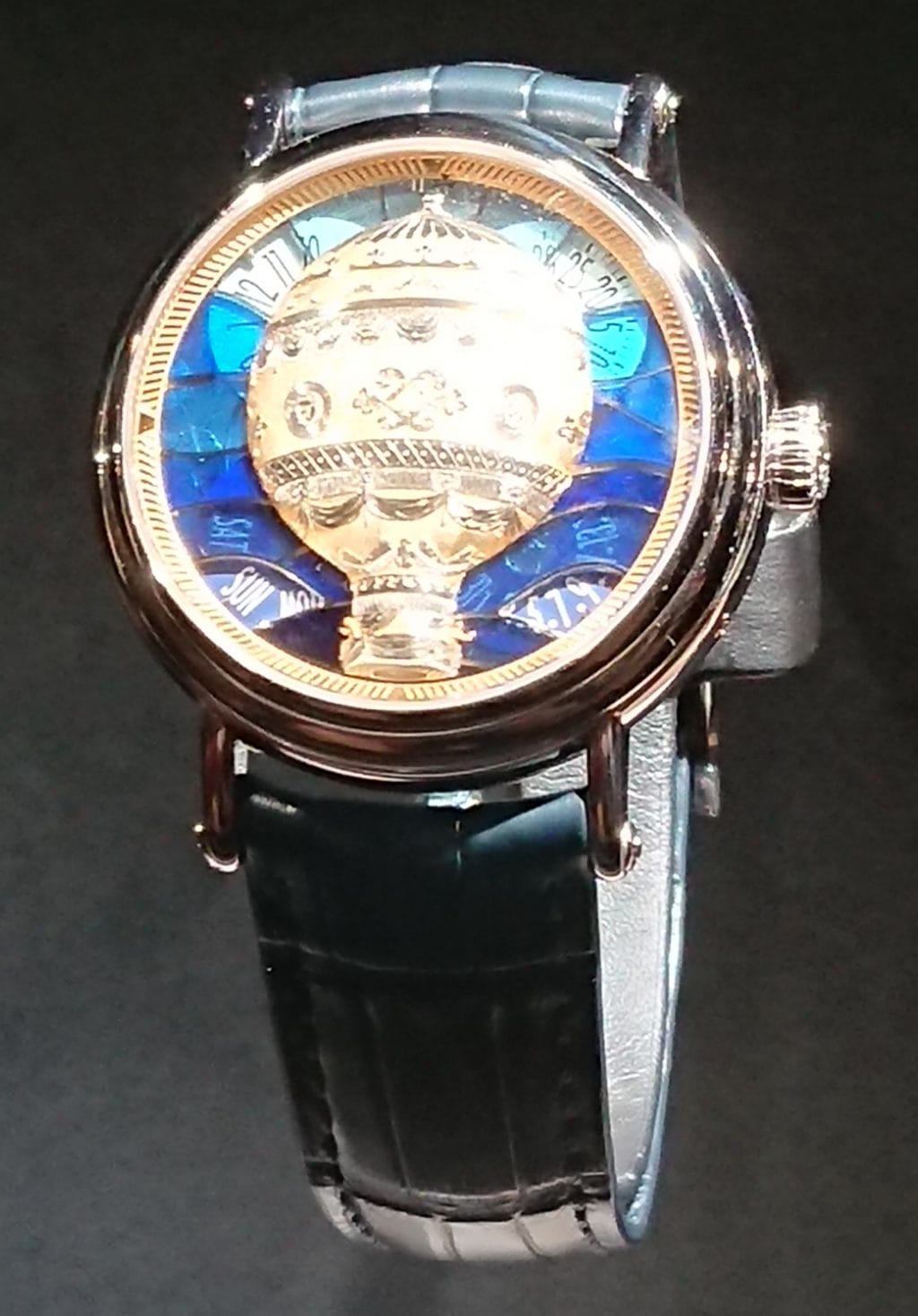 Minutieusement sculpté dans le relief de l’or selon la technique dite du ramolayage, chacun des aérostats illustrés dans cette série des Aérostiers se détache sur un fond de cadran décoré en émail translucide plique-à-jour. Chacun des 5 modèles sera proposé en 5 exemplaires. Quatre guichets laissent discrètement apparaître l’affichage par disques de l’heure, des minutes, du jour de la semaine et de la date.