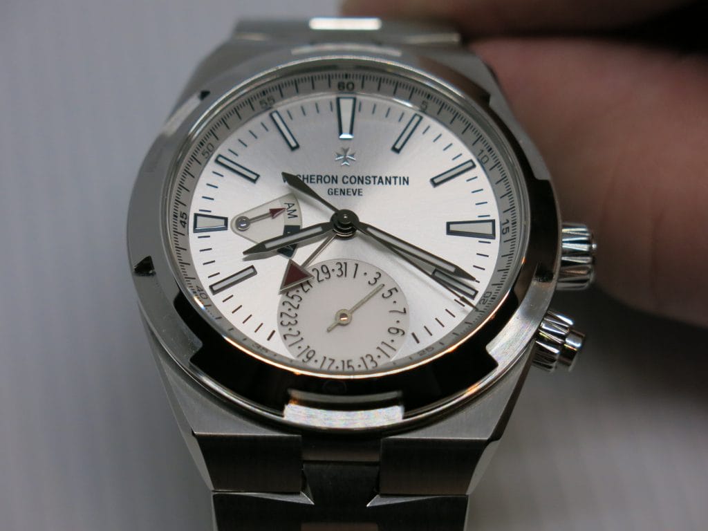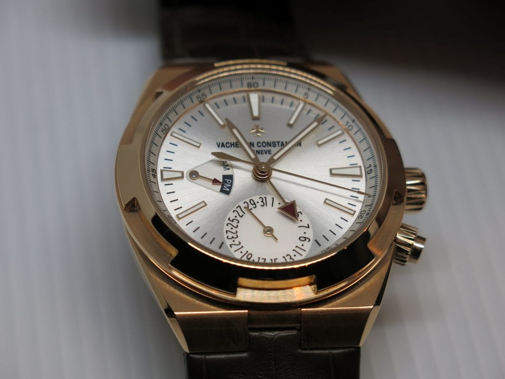 Du côté de la collection Overseas, la nouvelle venue qui nous a séduits est la Dual Time. Ici d’abord dans sa combinaison boîte acier et cadran bleu montée sur bracelet caoutchouc, elle permet la lecture simultanée de l’heure dans 2 fuseaux horaires. L’aiguille à flèche triangulaire pointe ici sur l’heure de référence, 6h sur la photo. Le repère AM/PM à 9h permet de savoir aisément qu’il y est 6h du matin (AM) et non 18h. L’heure locale fournie par les aiguilles heures et minutes est complétée de l’indication de la date par aiguille.