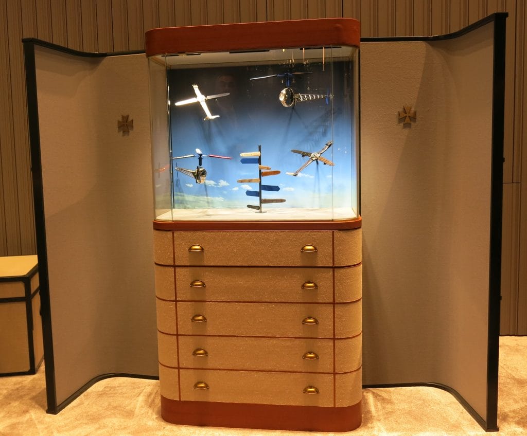 Le voyage démarre en altitude devant la vitrine qui met en valeur la nouvelle série Métiers d’Art réalisée en hommage à 5 vols historiques en aérostats effectués en France entre 1783 et 1785. C’est en effet à Paris le 21 novembre 1783 que s’envolent pour la première fois deux hommes, Pilâtre de Rozier et le marquis d’Arlandes, à bord d’une montgolfière gonflée à l’air chaud.