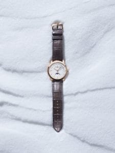 Cette pièce partage la pureté des lignes, l’intemporalité, l’authenticité qui définissent si bien tout le charme hivernal. Au-delà de laisser la plus belle des traces, devenir le propriétaire d’une Patrimony phase de lune et date rétrograde est une véritable invitation à tourner le regard vers le ciel. Une montre en or rose 18 carats 5N vibrant au rythme d’un calibre manufacture, qui reproduit sur son cadran le cycle et l’âge de la lune sur un fond constellé, sans correction requise pendant 122 ans. Vacheron Constantin marie cette complication élégante avec l’indication rétrograde de la date sur l’arc supérieur du cadran.
