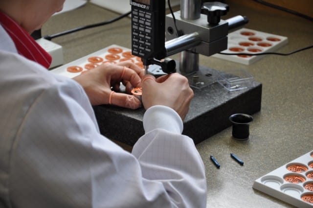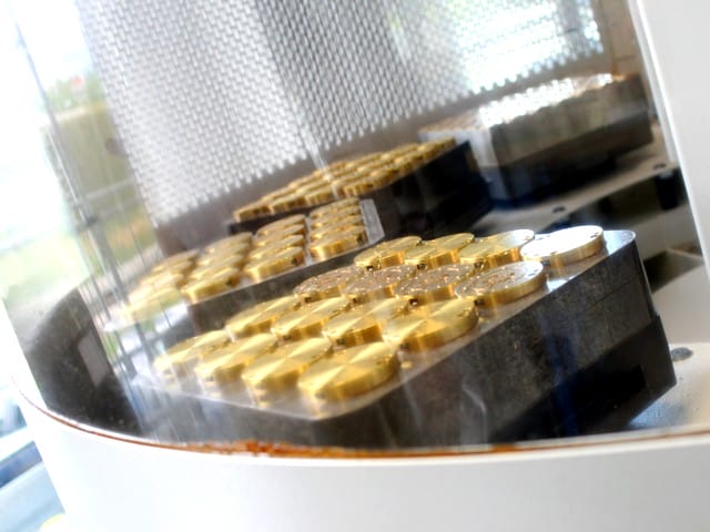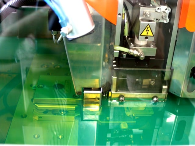 Cette image représente la machine en fonctionnement : les platines, étant plongées dans un bain, facilitent le fonctionnement de l’électro érosion. Elle peut fonctionner 24 heures/24 pour produire environ 500 pièces par jour :