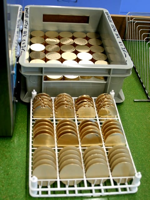 Ces machines peuvent tourner 24 heures/24, ce qui explique la présence de plateaux remplis de platines brutes comme ci-dessous :
