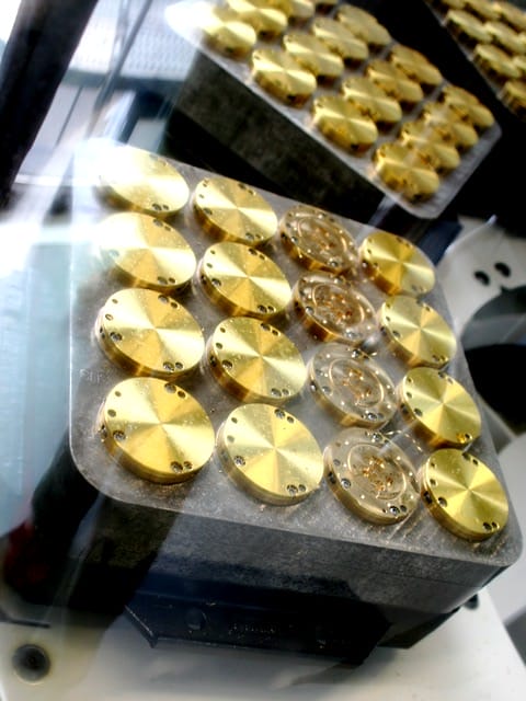 Une fois les tubes de laiton «tranchés», les platines partent au « car wash » afin d’enlever toute impureté et d’aplanir leur surface. Le résultat est le suivant :