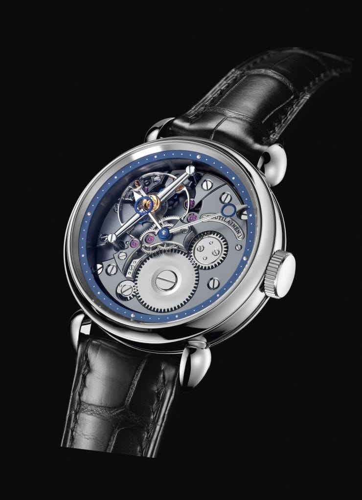Le mouvement tire sa particularité de cet échappement ; c’est la première fois qu’une montre présente deux roues d’échappement dans une telle configuration. Les roues d’échappement donnent une impulsion directe au balancier par le plateau d’impulsion rubis. Cet échappement est extrêmement efficace et nécessite moins d’énergie que les échappements à ancre traditionnels, ce qui offre un gain en termes de longévité et de stabilité dans l’utilisation quotidienne.