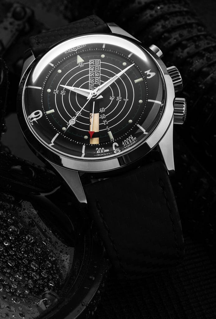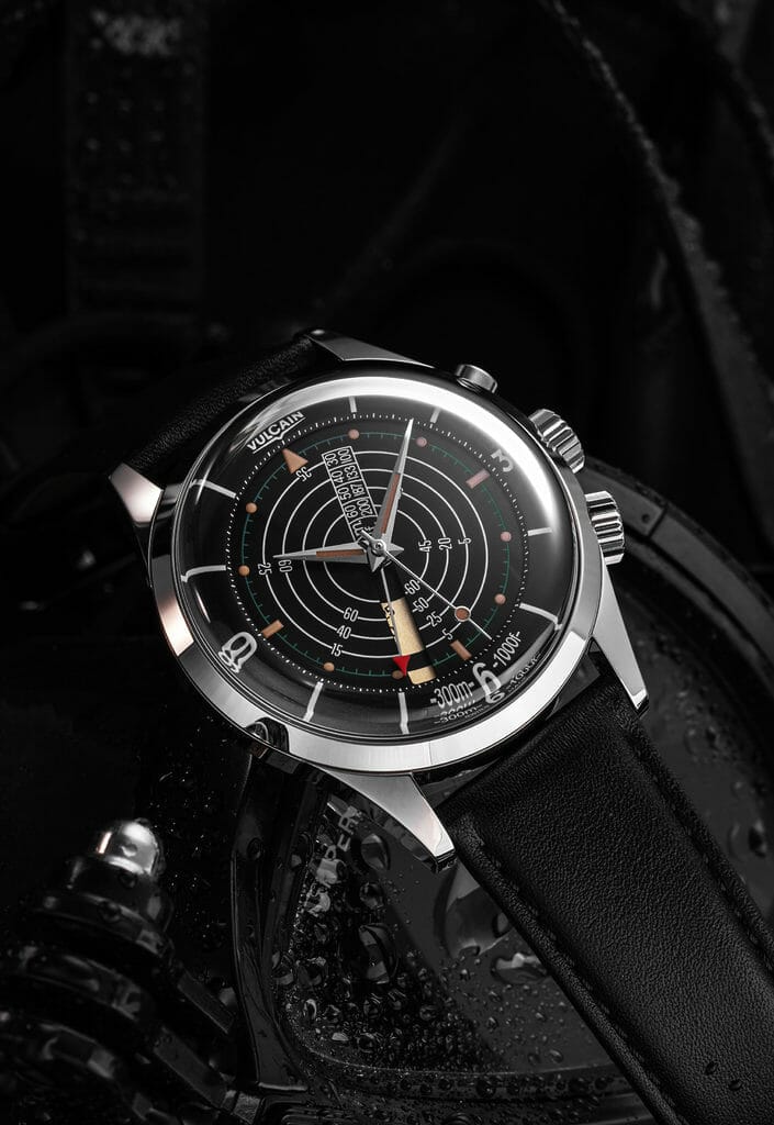 En 1961, Vulcain pouvait se vanter d’être l’une des seules Manufactures à proposer une montre de plongée équipée d’une alarme aquatique c’est-à-dire, une montre audible sous l’eau qui, grâce à son triple fond qui faisait office de chambre de résonance, permettait au plongeur de lui signaler le moment pour remonter à la surface. Mais la performance ne s’arrête pas là. Les amateurs de plongées sous-marine de l’avant-garde, ceux qui ne comptent que sur le calcul mental et leurs tables de paliers, seront sensibles à ses exploits ; Les autres, amateurs de garde-temps vintage, le seront à son esthétique.