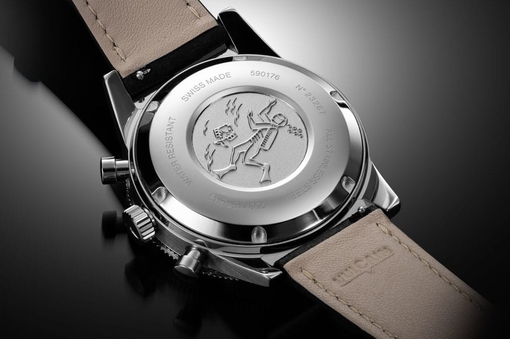 La nouvelle réédition de la Skindiver Chronograph est équipée d’un mouvement mécanique ETA 7753. Son style vintage affirmé en fait une concurrente sérieuse parmi les rééditions des montres de plongée classiques. Elle possède toutes les caractéristiques essentielles d’un modèle de plongée, notamment des index et aiguilles dotés de SuperLuminova pour une lisibilité optimale, une lunette crantée bidirectionnelle avec un insert en céramique noire, ainsi qu’un boîtier en acier de 39,7 mm offrant une étanchéité jusqu’à 200 mètres.