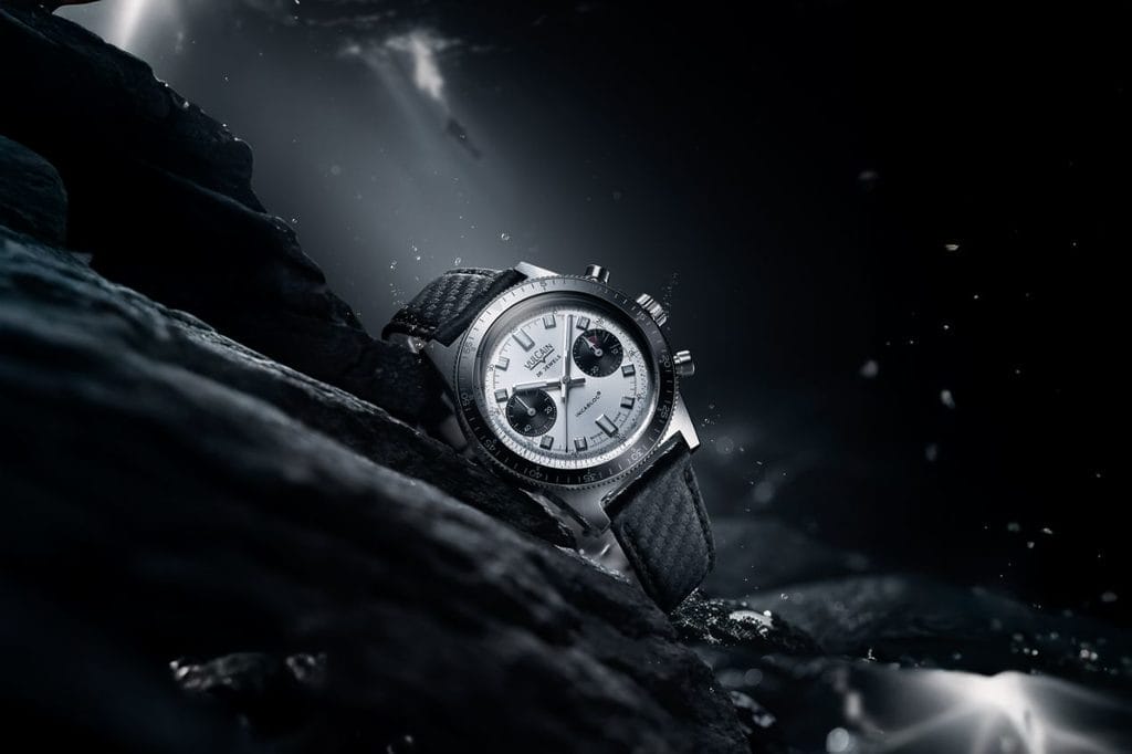 Les fonctions du chronographe sont bien mises en avant avec un sous-cadran des secondes positionné à 9 heures et un compteur 30 minutes à 3 heures, rehaussé d’un détail rouge ou orange selon la version. L’échelle tachymétrique sur le pourtour du cadran accentue son caractère sportif, renforcé par la gravure du fond de boîte représentant un plongeur en exploration.