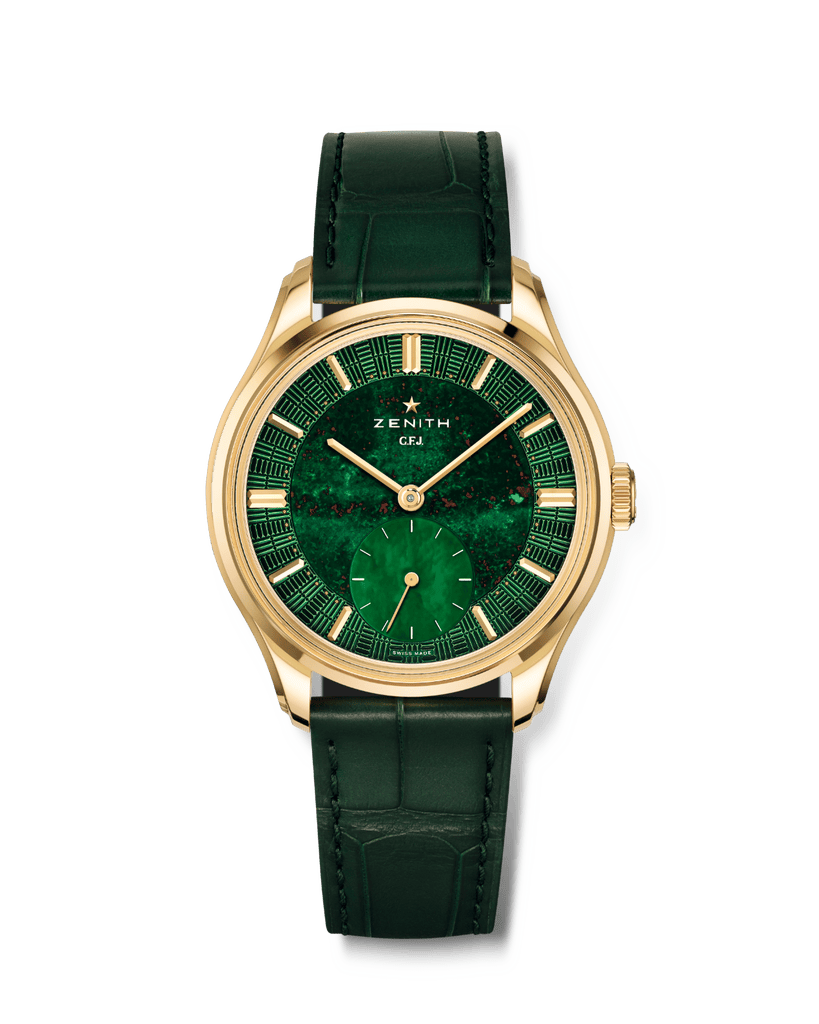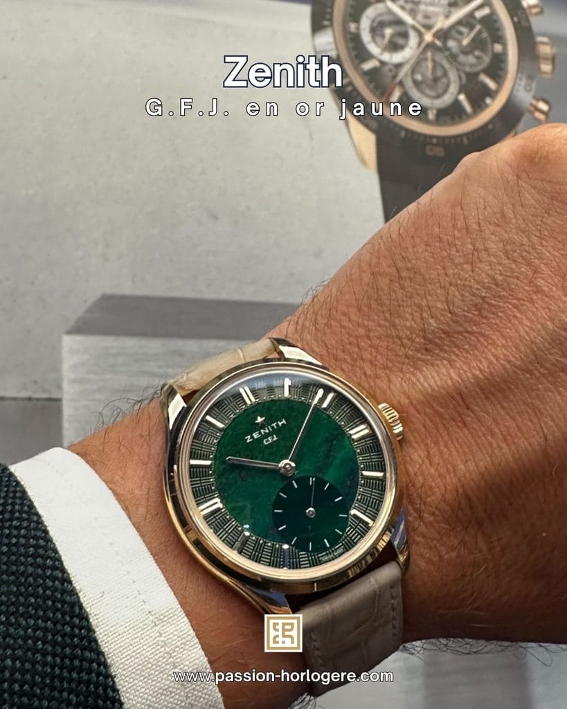 La deuxième pièce est la Zenith G.F.J. en or jaune. Ici, l’élégance prend un autre visage. Plus solaire, plus incarné, plus minéral aussi. Là où Parmigiani Fleurier travaille la nuance et la texture dans une forme de pureté presque méditative, Zenith choisit de faire vibrer son héritage chronométrique à travers une montre qui assume une présence plus charnelle.