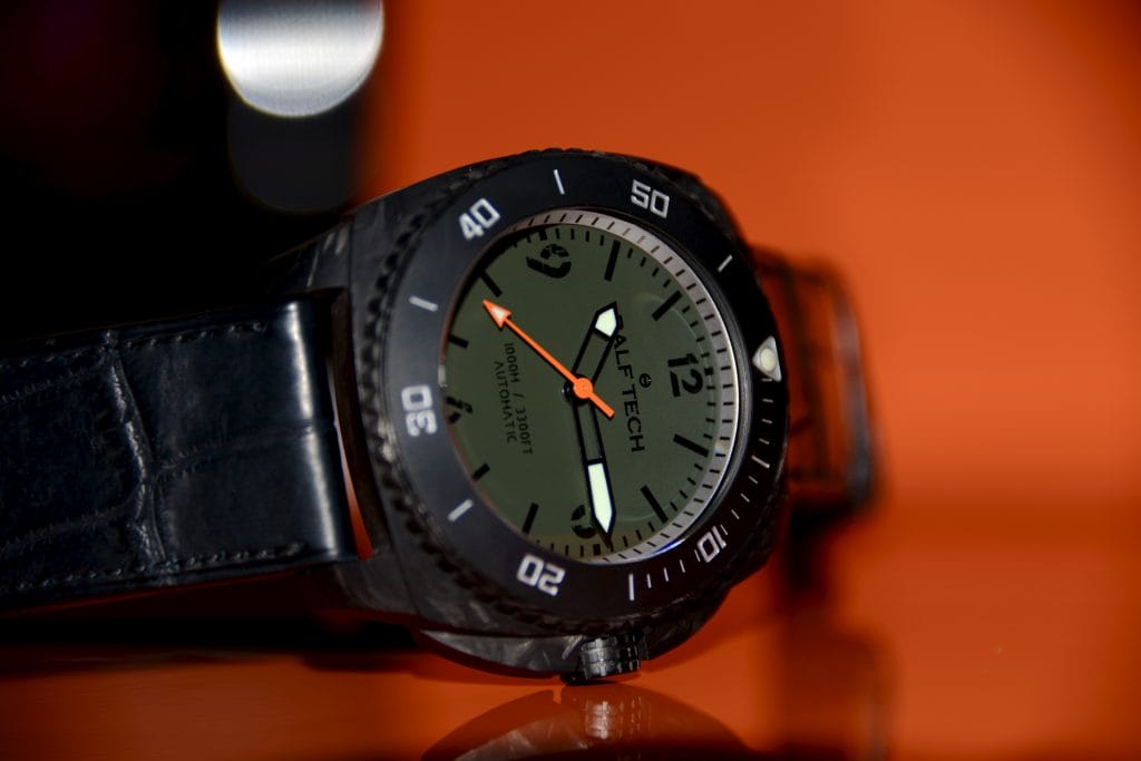 Visuellement, la discrétion du noir irisé et du cadran graphite tranche avec la trotteuse orange ainsi qu’avec les aiguilles avec insert luminescent professionnel « Superluminova® » C3. Son cadran arbore une teinte gris graphite mat avec une légère nuance kaki selon son orientation et la luminosité. Les index noirs marqués en chiffres arabes à 3-6-9-12 se distinguent eux par leur style industriel.