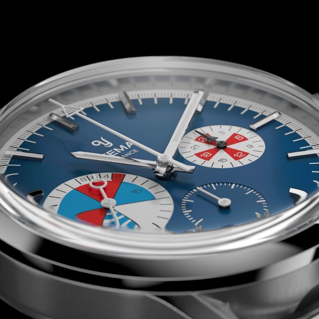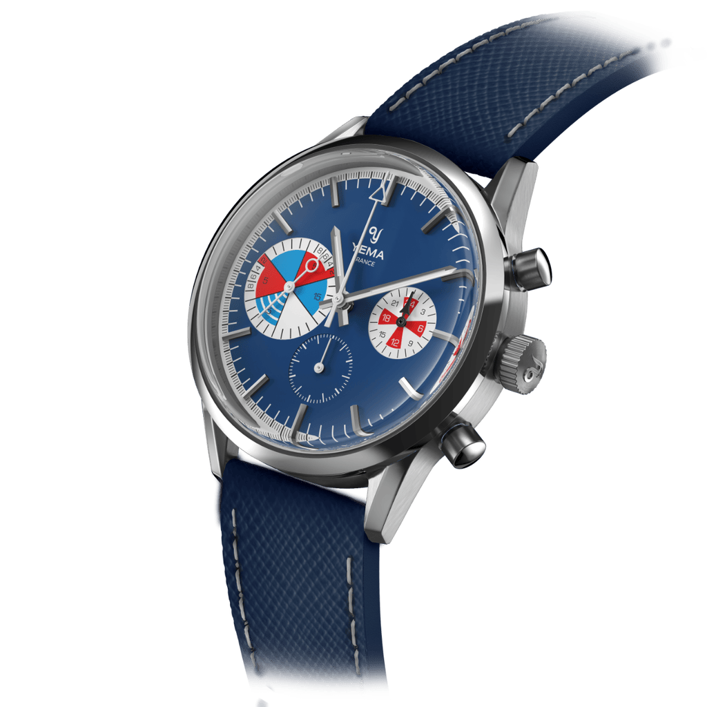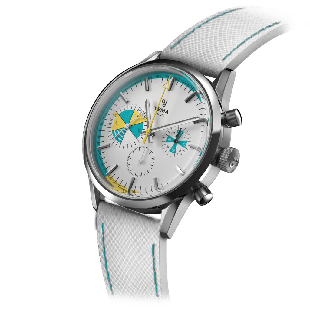 Le cadran, pièce maîtresse de ce modèle, mélange à la fois des couleurs vives tout en gardant la signature néo-vintage de YEMA. Celui-ci est composé d’une surface primaire mate et des index facettés en acier avec finition polie et en relief. Les index sont également assortis aux aiguilles des heures et des minutes et bénéficient de la même finition. Les deux sous-compteurs au design iconique et couleurs contrastées sont la signature de ce modèle. À neuf heures se trouve le compte à rebours surdimensionné des minutes pour la régate, à six heures l’aiguille des secondes et à trois heures le compteur 24 heures sous la forme d’une croix suisse inversée.