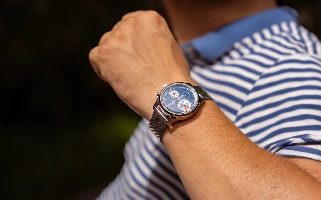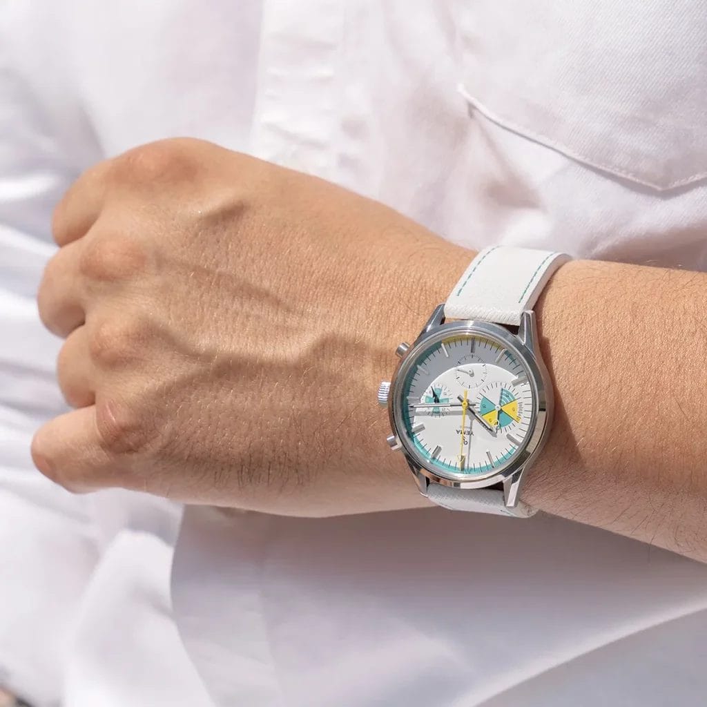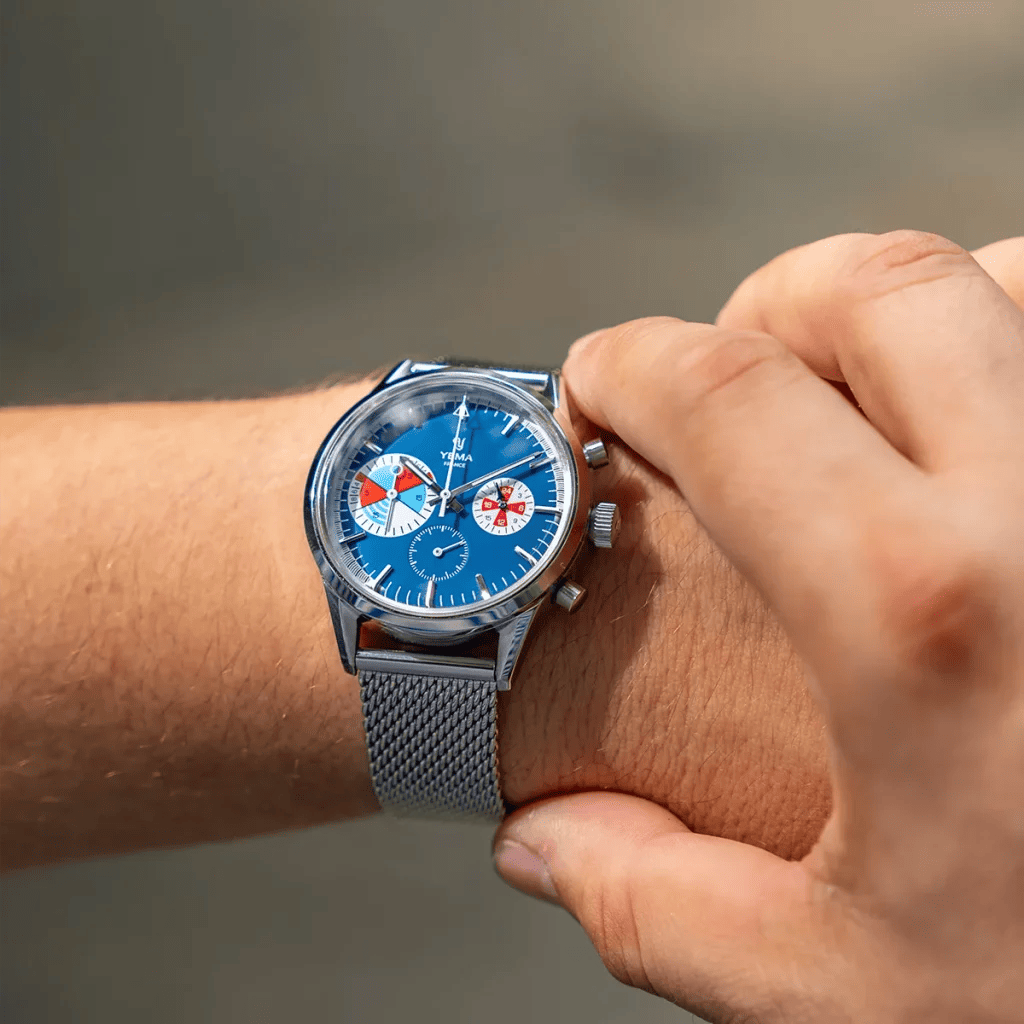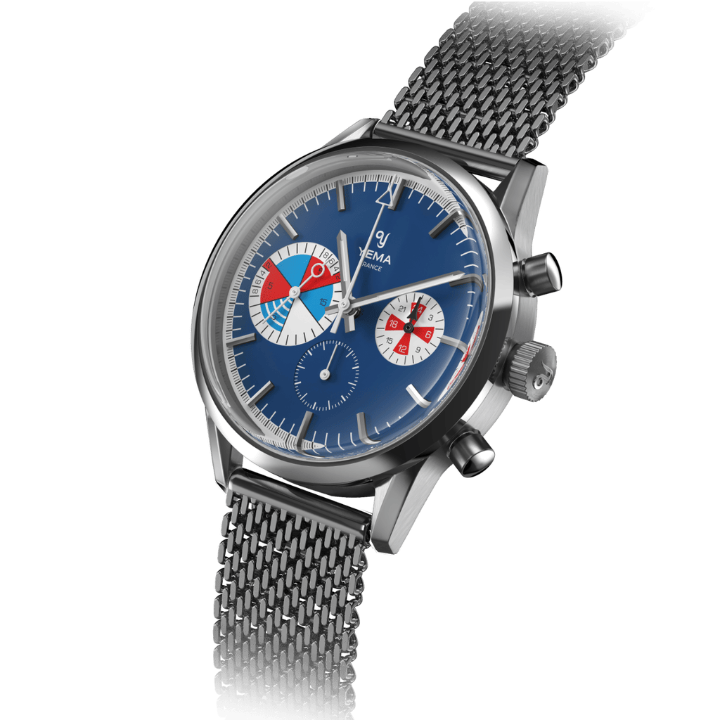 Le cadran, pièce maîtresse de ce modèle, mélange à la fois des couleurs vives tout en gardant la signature néo-vintage de YEMA. Celui-ci est composé d’une surface primaire mate et des index facettés en acier avec finition polie et en relief. Les index sont également assortis aux aiguilles des heures et des minutes et bénéficient de la même finition. Les deux sous-compteurs au design iconique et couleurs contrastées sont la signature de ce modèle. À neuf heures se trouve le compte à rebours surdimensionné des minutes pour la régate, à six heures l’aiguille des secondes et à trois heures le compteur 24 heures sous la forme d’une croix suisse inversée.
