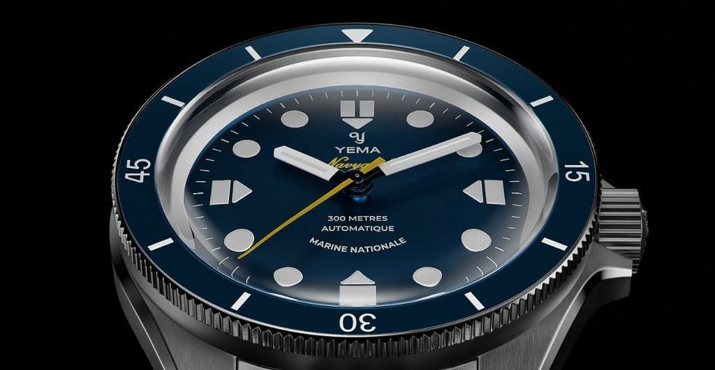Les aiguilles heures et minutes reprennent la géométrie et la finition des modèles Navygraf des années 70’s. Le centre du canon ainsi que les extrémités de départ des aiguilles sont assortis à la couleur du cadran tandis que les aiguilles sont elles entièrement peintes en blanc pour un contraste fort. La trotteuse iconique Navygraf en jaune apporte une touche de couleur et du caractère à ce modèle historique.