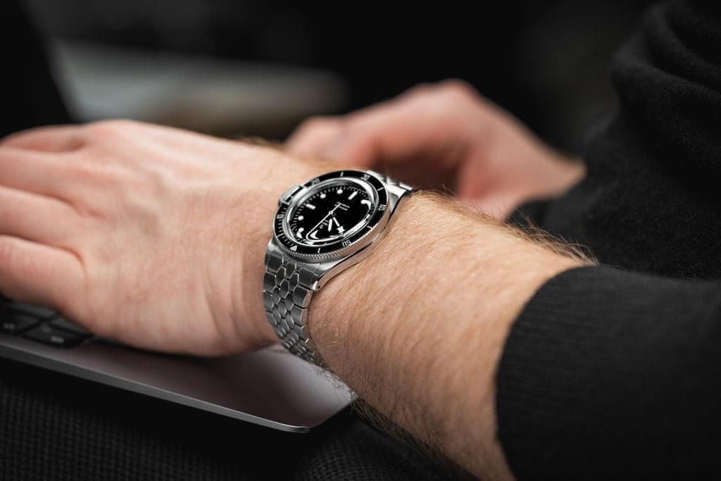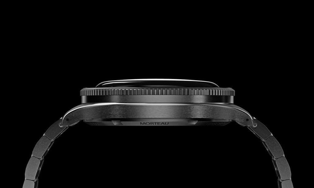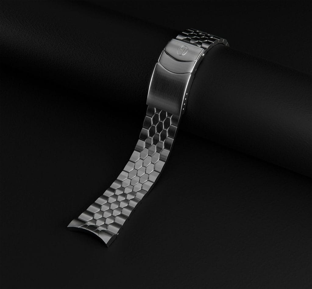 Ce nouveau boîtier 39mm en acier inoxydable 316L se distingue par ses cornes incurvées de 20mm et des finitions brossées ainsi que ses chanfreins polis légèrement galbés.