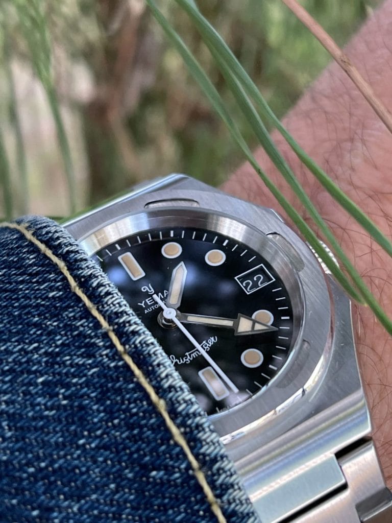 Le modèle Traveller nous offre, de même, un voyage dans le temps, au cœur des années 1970. Son boîtier en acier 316L de 39 mm de diamètre à 6 pans, étanche jusqu’à 100 mètres, n’est pas sans rappeler d’illustres icônes. Comme celles-ci, ce modèle se porte sur un bracelet usiné dans le même métal que la boîte, fermé par une boucle déployante. L’ensemble est valorisé par des finitions poli-miroir et satiné. Sous-pesée, la montre inspire une qualité de fabrication sans compromis. Apprécier un garde-temps nécessite le recours à ses sens. Après la vue, le toucher entre en action. Passer le derme des doigts sur les maillons confirme l’excellence du travail réalisé sur ces éléments. La surface est parfaitement polie dans le moindre détail. Aucun risque de voir les manches de chemises subir les assauts d’une finition aléatoire. Seul bémol, ajuster le bracelet de ce prototype à la taille d’un poignet standard, 17,5mm de circonférence, s’est soldé par un échec. Cette opération aurait nécessité de recourir aux services d’un horloger professionnel outillé. Les montres finalisées ne rencontreront probablement pas cet écueil.