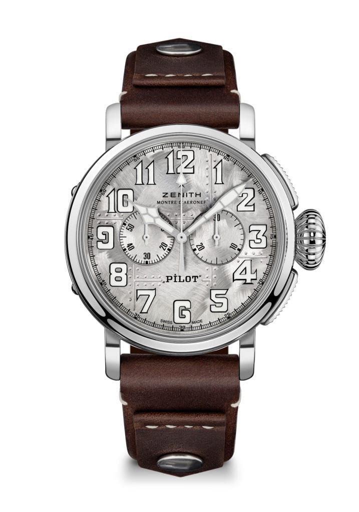 Éditée à seulement 250 exemplaires, la Pilot Type 20 Chronograph Silver rappelle le patrimoine unique de Zenith dans le monde de montres d’aviateurs qui s’étend sur plus d’un siècle. La Manufacture a en effet accompagné les pionniers de l’aviation au début du 20ème siècle, notamment avec Louis Blériot et son vol historique à travers la Manche en 1909. Le boîtier 45 mm en argent massif témoigne d’ailleurs d’une inspiration visuelle directement puisée dans le monde des aéronefs. Tel le fuselage d’un avion, le cadran argenté présente des rivets évoquant des panneaux métalliques, avec une surface satinée irrégulière pour faire ressortir la beauté brute du métal. Afin d’assurer lisibilité maximale à tout instant, les index arabes surdimensionnés et les aiguilles « cathédrales » de la signature Pilot sont recouverts d’une peinture blanche luminescente. Pour compléter le look « aviateur », la montre s’arrime au poignet par un bracelet en cuir de veau marron avec rivet et boucle à ardillon en acier poli, complétée d’une languette caractéristique rappelant celles des casques de pilote d’époque.