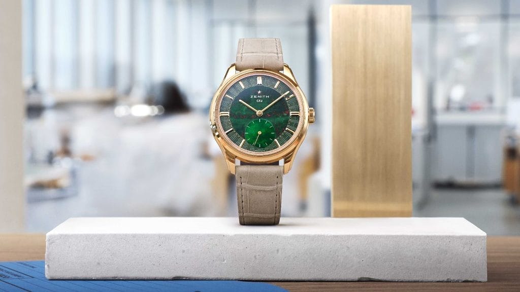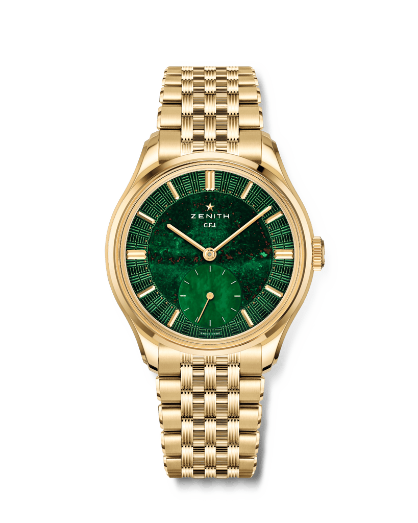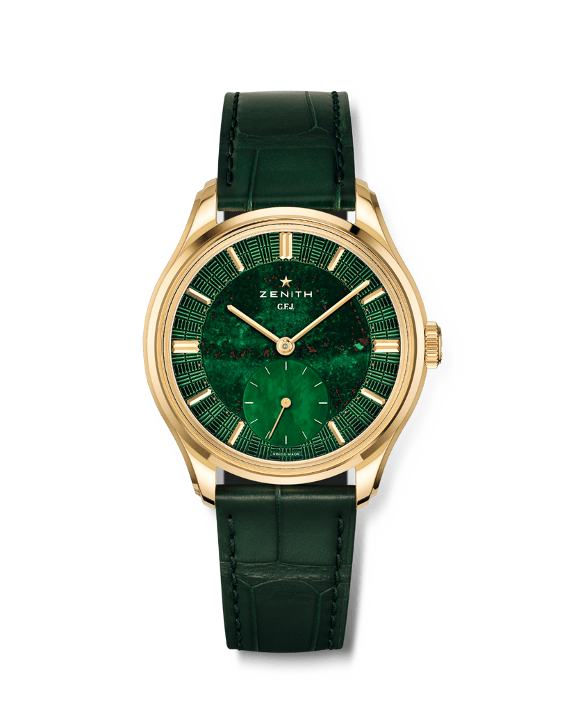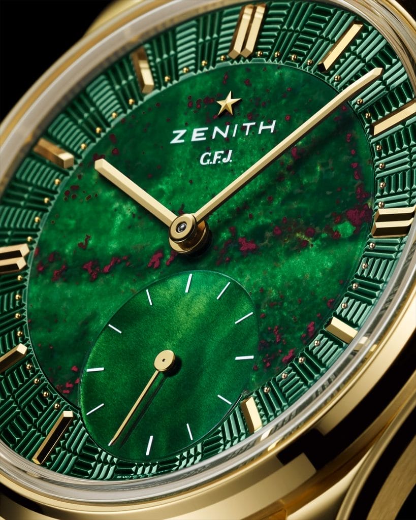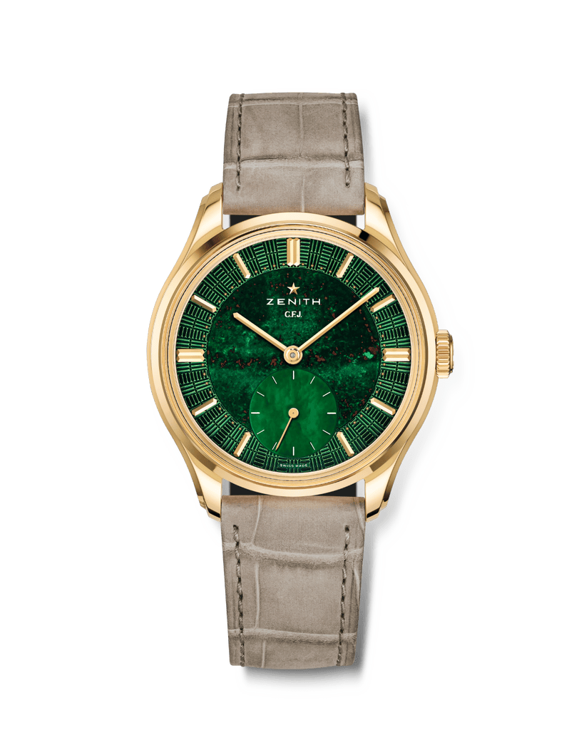 Le cadran mérite à lui seul que l’on s’y arrête longuement. Zenith a conservé la construction en trois parties propre à cette collection, mais lui offre un visage particulièrement expressif. Au centre, le jaspe sanguin impose sa présence organique, avec ses nuances vertes parcourues d’inclusions rouges qui rendent chaque exemplaire unique. À six heures, la petite seconde surdimensionnée en nacre introduit une respiration plus douce, presque opaline. Autour de cet ensemble, le secteur périphérique guilloché reprend un motif inspiré de la façade en briques de la manufacture Zenith au Locle. L’ensemble aurait pu paraître démonstratif ; il se révèle au contraire remarquablement équilibré, entre puissance minérale, architecture horlogère et codes classiques.