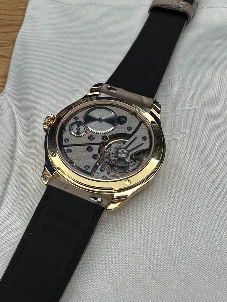 Au dos, le calibre 135 se laisse admirer sous un fond saphir. La décoration, retravaillée par rapport à l’édition anniversaire précédente, revient à des codes plus classiques avec de larges Côtes de Genève, des anglages soignés à la main et une finition ruthénium sombre relevée de gravures dorées. Là encore, Zenith semble avoir cherché la cohérence plutôt que la démonstration. Ce mouvement n’est pas seulement montré, il est mis en scène comme la raison d’être de la montre. C’est sans doute là que réside la vraie réussite de cette G.F.J. : elle ne plaque pas un beau dessin sur une belle mécanique, elle construit une montre entière autour d’une culture de la chronométrie.