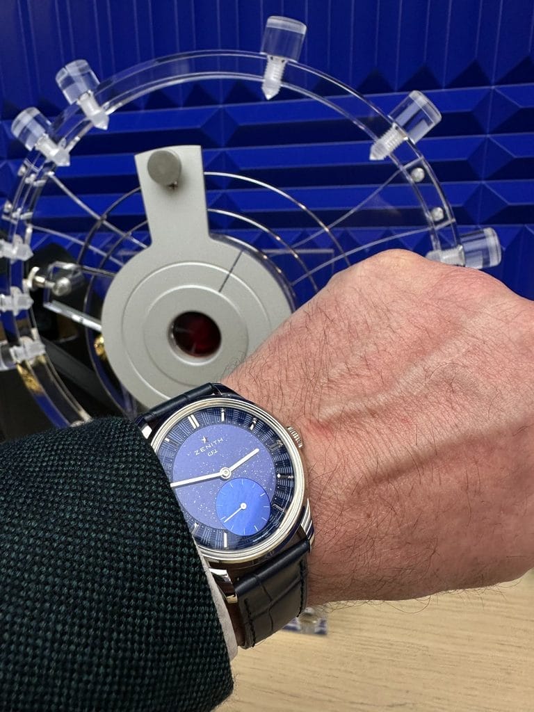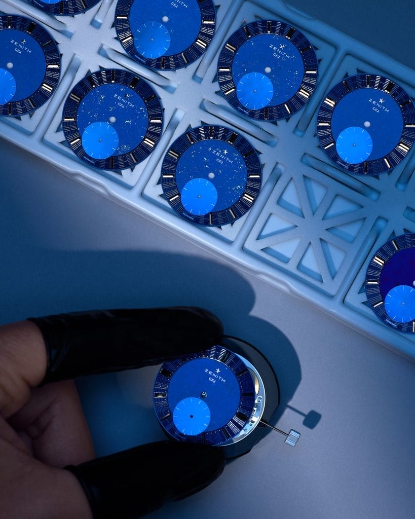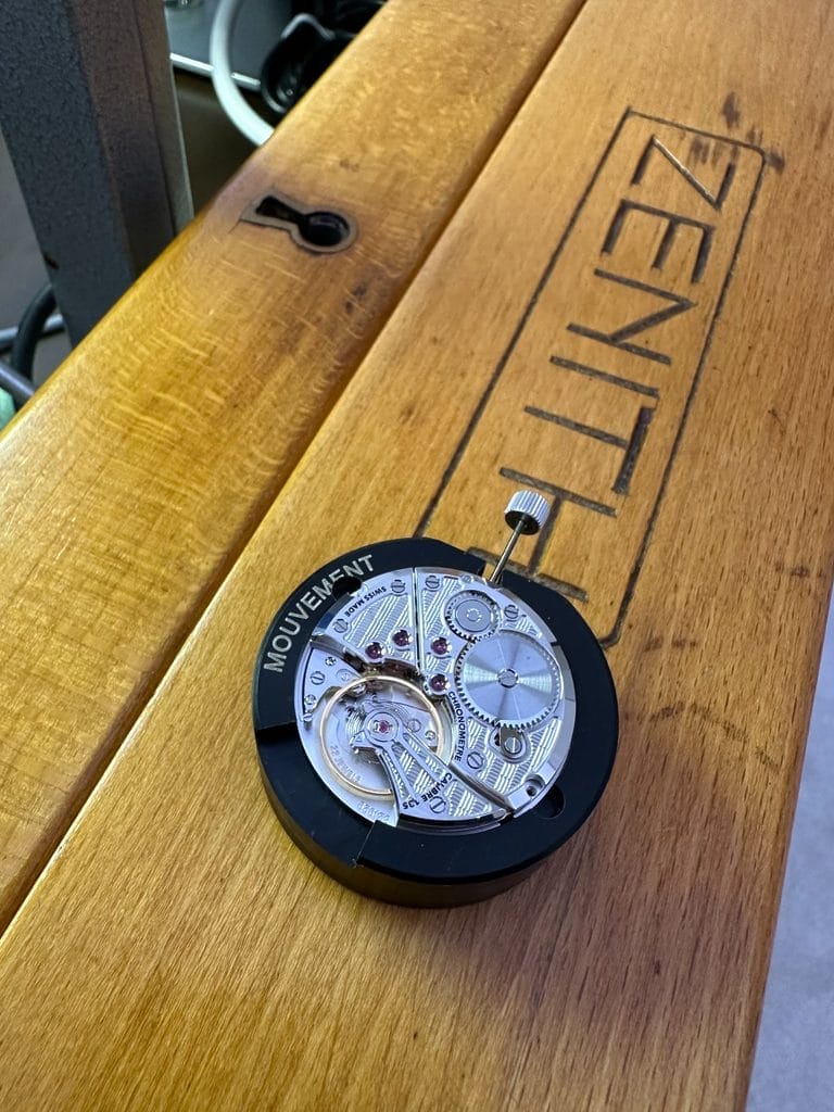 À cela s’ajoute une démarche esthétique profondément identitaire. Les ponts, délicatement décorés d’un guilloché “brique”, font écho à la façade de la manufacture historique de Zenith, dont les briques rouges et blanches forment les initiales G.F.J. Le barillet adopte une finition satinée circulaire, tandis que la roue de couronne, polie noir, capture la lumière avec une intensité rare. Chaque composant a été pensé pour allier lisibilité, profondeur visuelle et signature patrimoniale.
