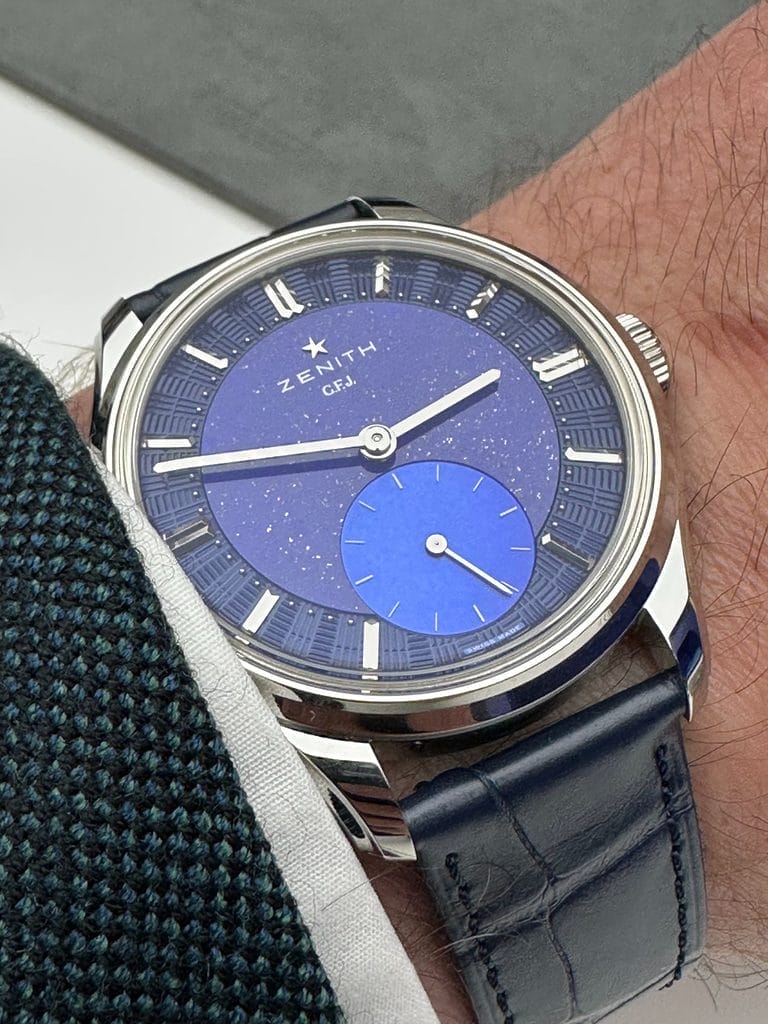 Livrée avec trois bracelets interchangeables — alligator bleu, veau noir classique et veau bleu “Saffiano” — la G.F.J. propose également, sur demande, un bracelet en platine à sept rangs, dont les maillons centraux reprennent le motif “brique”, ultime clin d’œil à l’architecture Zenith. Une boucle ardillon en platine gravée des initiales G.F.J. vient compléter l’ensemble.