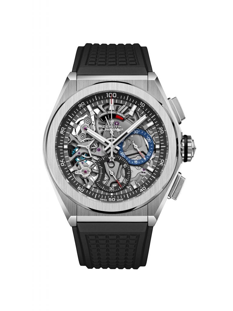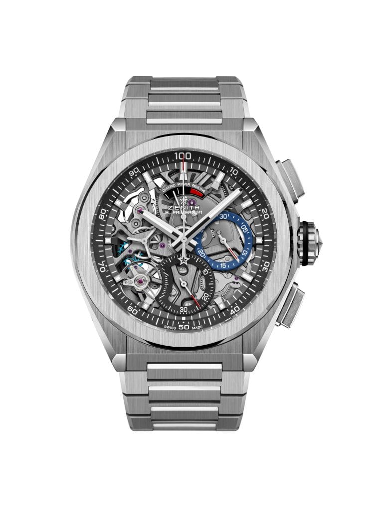 Le ZENITH DEFY EL PRIMERO 21 représente un bond en avant, tant en matière de performance que de construction mécanique. Pour Zenith, il s’agit d’une compétition contre personne sinon soi-même. Le mouvement fraichement réinventé de ce remarquable garde-temps oscille à une fréquence de 360’000 A/H (50 Hz), soit dix fois celle de de son prédécesseur, l’illustre El Primero, permettant maintenant une précision au 1/100e de seconde. Cette fréquence époustouflante est sublimée par un affichage au design exquis : le rehaut gradué de 1 à 100 est parcouru par une aiguille à la vitesse fulgurante d’un tour par seconde, offrant un impact visuel sans précédent et une impression de voyage temporel surréaliste à son heureux porteur. Cette complication mécanique hors-normes renferme un nombre bien moindre de composants et minimise ainsi les assemblages et les ajustements fastidieux, tout en répondant aux tendances de l’ingénierie de développement moderne et en assurant une performance optimale. En plus d’une performance et d’une structure mécanique significativement complexifiées, le design du DEFY EL PRIMERO 21, certifié chronomètre par le TIMELAB, puise son inspiration dans la beauté robuste de son aîné lancé en 1969. Cerclé d’un boîtier 44mm en titane grade 5, le cadran ouvert du DEFY EL PRIMERO 21 offre un décor résolument contemporain aux codes identitaires caractéristiques du légendaire modèle originel : trotteuse étoilée, index facettés et grandes aiguilles bâtons luminescentes, l’ensemble rendant un fier hommage au patrimoine dans une superbe démonstration de brillance futuriste.