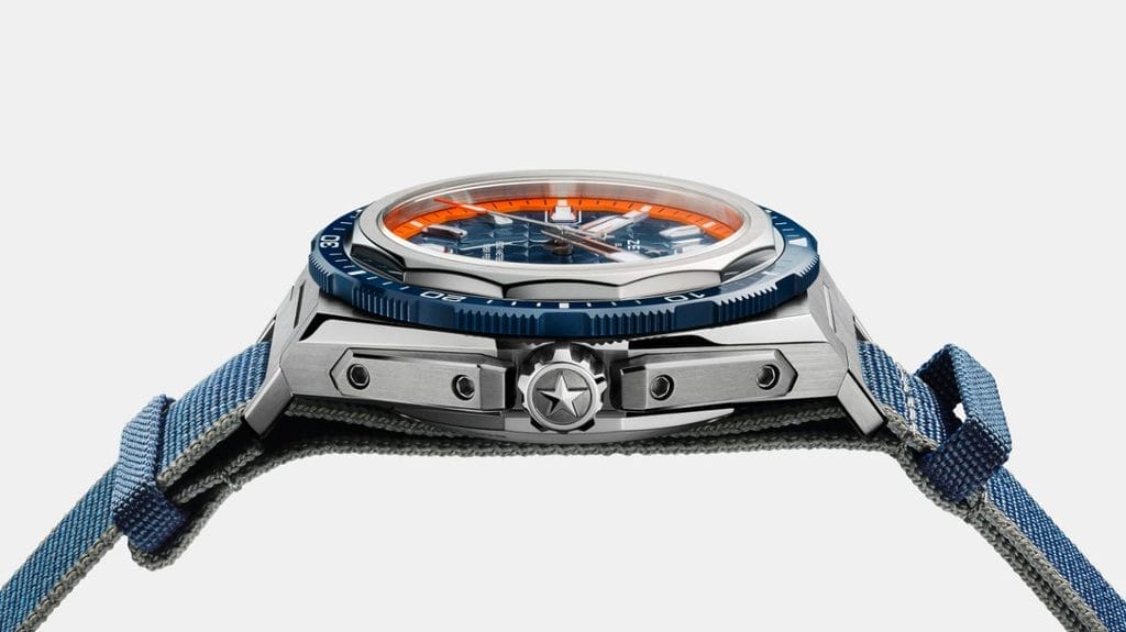 La DEFY Extreme Diver présentée sur un bracelet à trois maillons en titane est fournie avec deux bracelets supplémentaires. Le premier bracelet est en caoutchouc FKM assorti à la couleur du cadran, avec une texture de type Cordura et des orifices sur le côté permettant à l’eau de s’écouler. Conformément à l’initiative HORIZ-ON de ZENITH visant à réduire l’impact environnemental de la marque et à produire de manière plus durable, la DEFY Extreme Diver est également livrée avec un bracelet extra-long fabriqué à partir de filets de pêche recyclés, destiné à être porté sur une combinaison de plongée. Il comporte des extrémités spécifiques permettant de faire passer le bracelet d’un seul tenant sous le boîtier afin de le sécuriser.