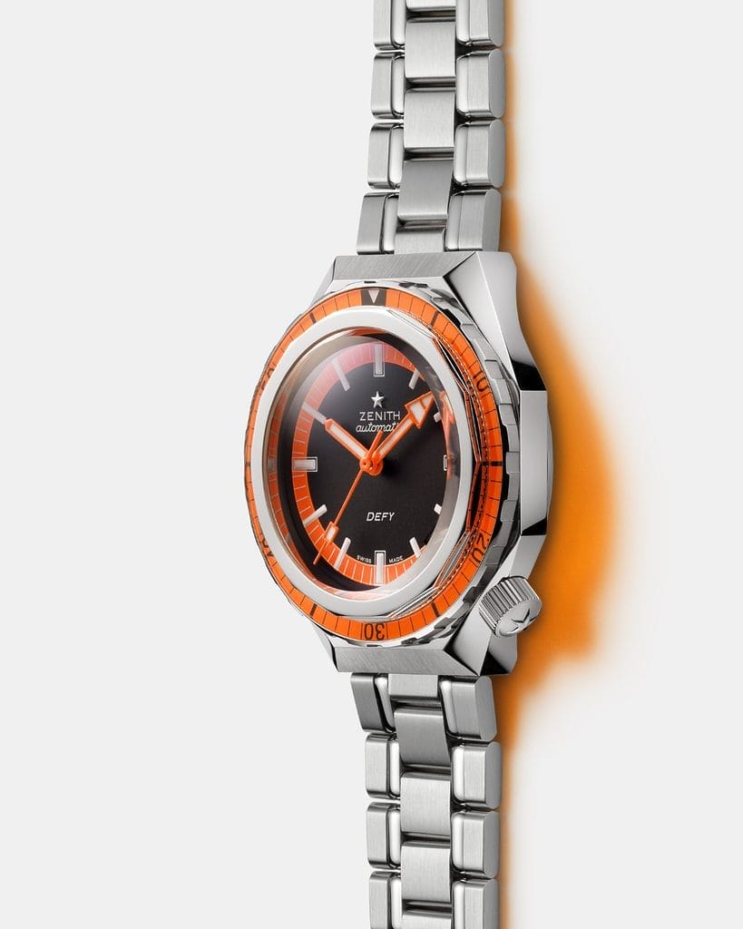 Signature distinctive de la ligne DEFY d’origine, le boîtier en acier de 37 mm de diamètre de la DEFY Revival A3648 est très anguleux. On retrouve la lunette en acier à quatorze côtés présente sur les modèles DEFY de l’époque, mais placée au-dessus de la lunette tournante ronde. Cette lunette unidirectionnelle an acier accueille un insert en verre saphir, et non en plexiglas comme sur les modèles historiques, avec les mêmes inscriptions en noir sur fond orange vif – l’une des caractéristiques les plus convoitées de l’A3648 historique.