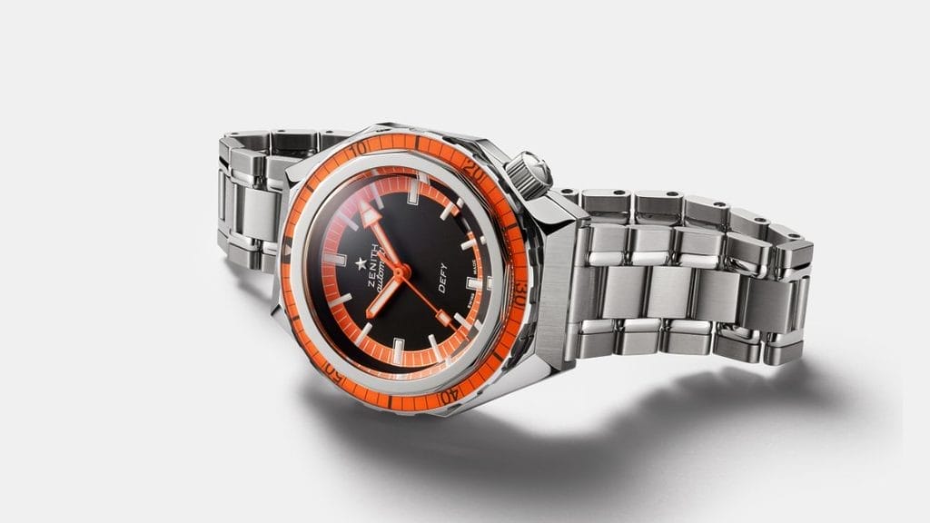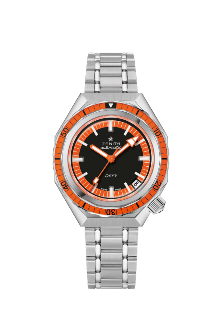Le thème noir et orange s’étend au cadran, avec une surface noir mat contrastée par des aiguilles et un chemin des minutes orange. Les index des heures et les aiguilles sont remplis de Super-LumiNova blanc à émission de lumière verte, brillante et durable. Avec sa couronne vissée à 4 heures et son fond saphir, la DEFY Revival A3648 reste étanche à 600 mètres (60 ATM), un exploit considérable pour une création de 1969 et encore impressionnant pour une montre de plongée particulièrement compacte avec fond saphir. Un nombre symbolique pour ZENITH car 600 mètres correspondent à 1 969 pieds – année de lancement de la ligne de montres bracelets DEFY, dont l’A3648. Le fond du boîtier dévoile le mouvement automatique de manufacture Elite 670, doté de 50 heures de réserve de marche.