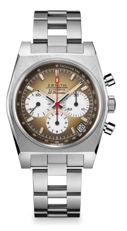 Cette année, avec la Chronomaster Revival A385, Zenith revisite la première montre El Primero avec un cadran à effet dégradé, datant de 1969. L’une des pièces les plus marquantes de l’histoire d’El Primero, l’A385 a été l’un des trois chronographes d’origine en acier inoxydable abritant le premier chronographe automatique à haute fréquence du monde. Son boîtier en acier de forme tonneau abritait un cadran marron en dégradé qui accroche le regard. Ce fut peut-être le premier cadran « fumé » jamais réalisé dans l’industrie horlogère et certainement le premier proposé par Zenith.