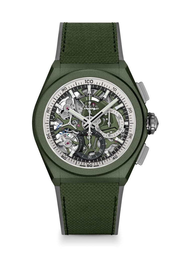 Pour la première fois chez Zenith, la manufacture a revêtu son chronographe au 1/100e de seconde d’une armure en céramique verte pour la DEFY 21 Urban Jungle. Très résistant aux rayures et intensément coloré, le boîtier en céramique vert kaki de ce modèle est doté d’une finition entièrement mate, passant ainsi sous le radar tout en restant bien présent pour son porteur. Visible à travers le cadran ajouré avec des compteurs noirs et argentés à finition matte, l’inégalable chronographe à haute fréquence avec ses deux organes régulateurs est orné d’une platine de couleur vert kaki et d’une masse oscillante en forme d’étoile. Un bracelet en caoutchouc gris avec un insert en caoutchouc vert à effet cordura offre une touche finale.