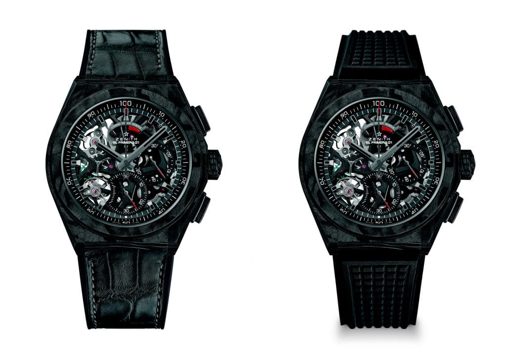 Pour compléter l’ergonomie du DEFY El Primero 21 Carbon, le porteur peut choisir entre deux bracelets : un bracelet en caoutchouc texturé noir et un bracelet en caoutchouc spécial avec effet carbone pour une esthétique indéniablement urbaine.