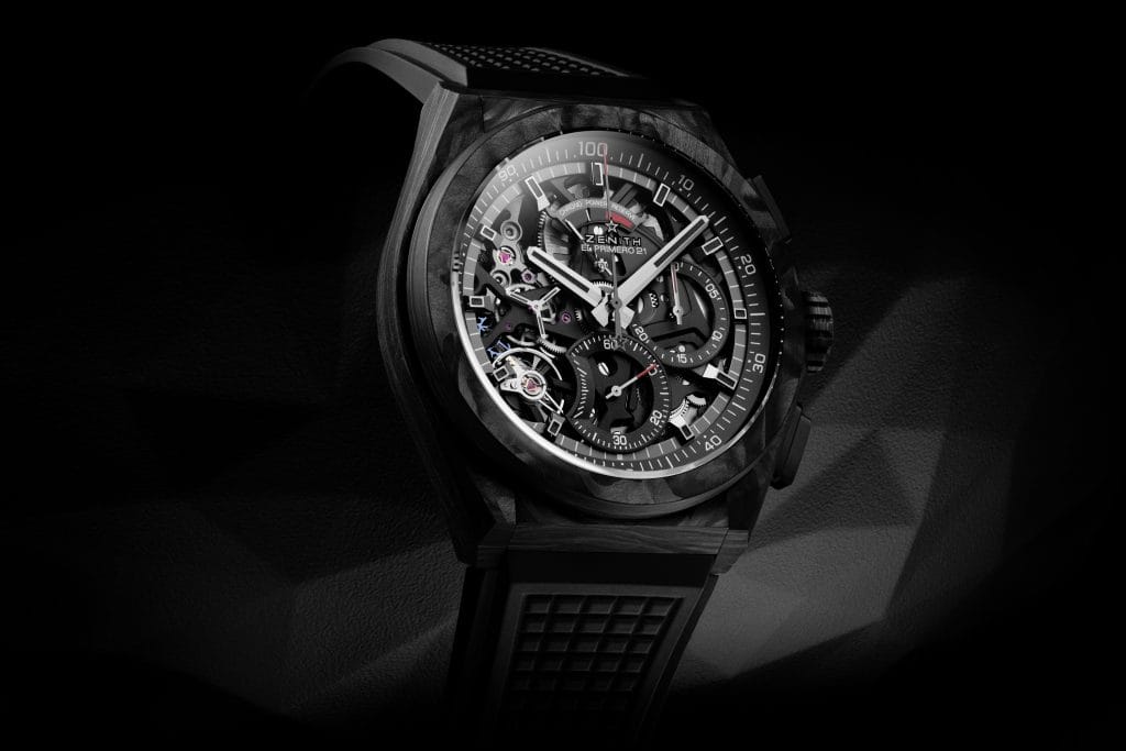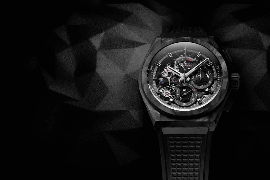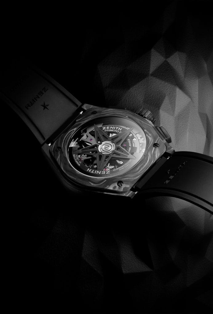 Avec un boîtier façonné dans un matériau avant-garde tel que le carbone, il était tout naturel que le cadran et le mouvement soient conçus en accord avec son allure mystérieuse. Pour la première fois au sein d’un DEFY El Primero 21, le calibre chronographe 1/100e de seconde de pointe – fonctionnant à la cadence phénoménale et inégalée de 360’000 alternances par heure (50 Hz) – est revêtu d’un noir profond, permettant aux arrêtes brillantes du mouvement squelette novateur de briller dans l’obscurité. Le cadran ajouré est également noir, tout en restant facilement lisible grâce à ses marques blanches contrastantes. Les aiguilles des heures, des minutes et des secondes, tout comme les index en applique, sont facettées, revêtues de ruthénium foncé et remplies de Super-LumiNova® noir qui émet un éclat subtil dans le noir. Tout en mettant l’accent sur sa fonction chronographe à grande vitesse inégalée, l’aiguille centrale 1/100e de seconde et les compteurs des secondes et des minutes ont des aiguilles noircies avec des pointes rouge vif. Un look qui incarne la philosophie néo-futuriste et architecturale de Zenith en créant les garde-temps de demain pour les passionnés de montres d’aujourd’hui, soucieux de leur style.