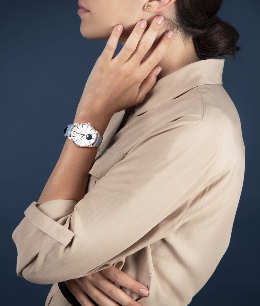 La Phase de Lune Elite, majestueuse dans ses tons et fantasque dans son asymétrie harmonieuse, soulève le voile de la nuit pour faire ressortir la beauté enchanteresse de la lune. Un cercle bleu nuit sur la moitié inférieure du cadran à motif soleillé prend la même tonalité que le disque des phases de lune, donnant l’impression d’un affichage surdimensionné de la lune et des étoiles dorées. En juxtaposition, une aiguille de petite seconde à 9 heures rappelle le caractère éphémère du temps.
