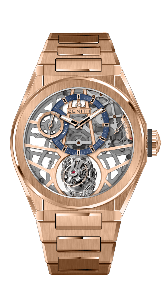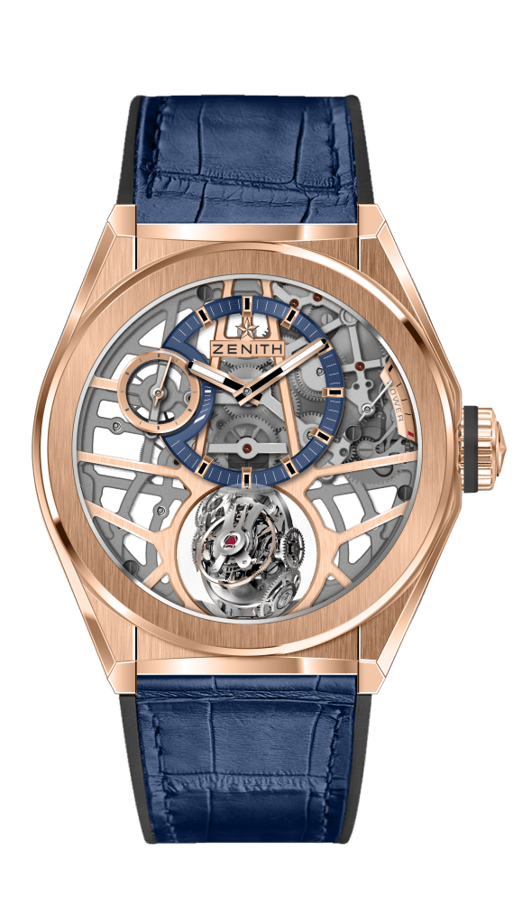 Cette nouvelle grande complication DEFY se révèle sous des traits modernes et stylisés. Visible sur deux versants, le mouvement entièrement squeletté et rhodié noir contraste avec la clarté des cinq fines branches évoquant l’étoile Zenith décentrée. Assorties au matériau du boîtier, elles soulignent l’effet tridimensionnel de cette architecture dynamique. Le module gyroscopique redimensionné évolue en majesté à 6h, tandis qu’heures et minutes décentrées s’affichent sur une bague bleutée aux aiguilles bâtons et index facettés luminescents. En symétrie, petite seconde ajourée et réserve de marche se lisent par de fines aiguilles à 9h30 et 2h30. Forgé dans l’or rose ou le titane, le boîtier de 44 mm de diamètre étanche à 100 mètres se noue aux poignets masculins par un nouveau bracelet intégré du même métal aux maillons en H brossés et polis ou en caoutchouc recouvert de cuir d’alligator. Style et Haute Horlogerie selon Zenith.