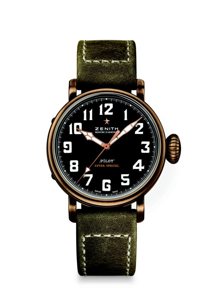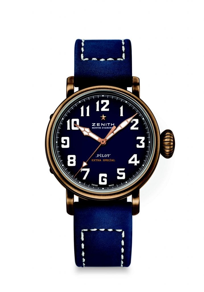 En 2018, la marque à l’étoile donne une nouvelle dimension à sa collection emblématique inspirée par les légendaires montres de pilote Zenith du passé et lance une Pilot de 40 mm en bronze. Dotée de l’imposante couronne cannelée, des chiffres luminescents surdimensionnés et du moteur automatique maison de ses prédécesseurs, la nouveauté est merveilleusement mise en valeur par des cadrans mats, bleu ou noir, et des bracelets en nubuck gras, bleu coordonné ou vert kaki typiquement militaire, avec coutures contrastées.