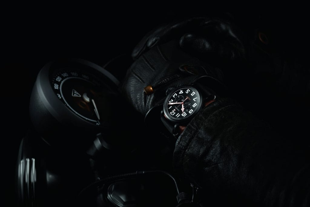Comme les motos du même nom, la PILOT Type 20 Chronograph Ton Up Black est doté d’un boîtier masculin de 45 mm de diamètre en acier subtilement vieilli, une manière tendance de souligner le caractère vintage et de respecter le design global de la montre, la PILOT Type 20 Chronograph Ton Up Black associe un cadran mat sombre à un revêtement noir et arbore un fond gravé d’un pilote de café racer sur sa moto. Pour plus de confort et de longévité, le bracelet en nubuck gras caractéristique intègre une doublure de protection en caoutchouc, des coutures contrastées blanches faites main et une boucle en titane. Animé par un calibre maison légendaire, le El Primero 4069 automatique doté d’une fréquence de 5 Hz (36’000 A/h) et d’une réserve de marche de 50 heures.