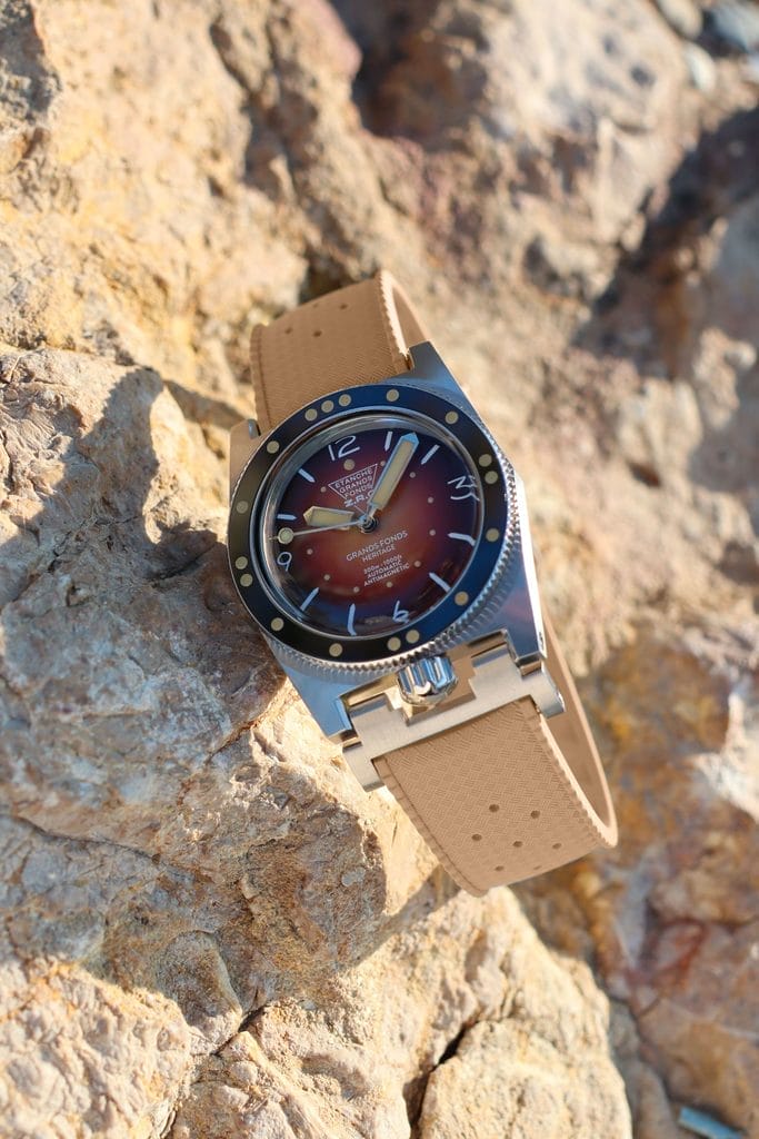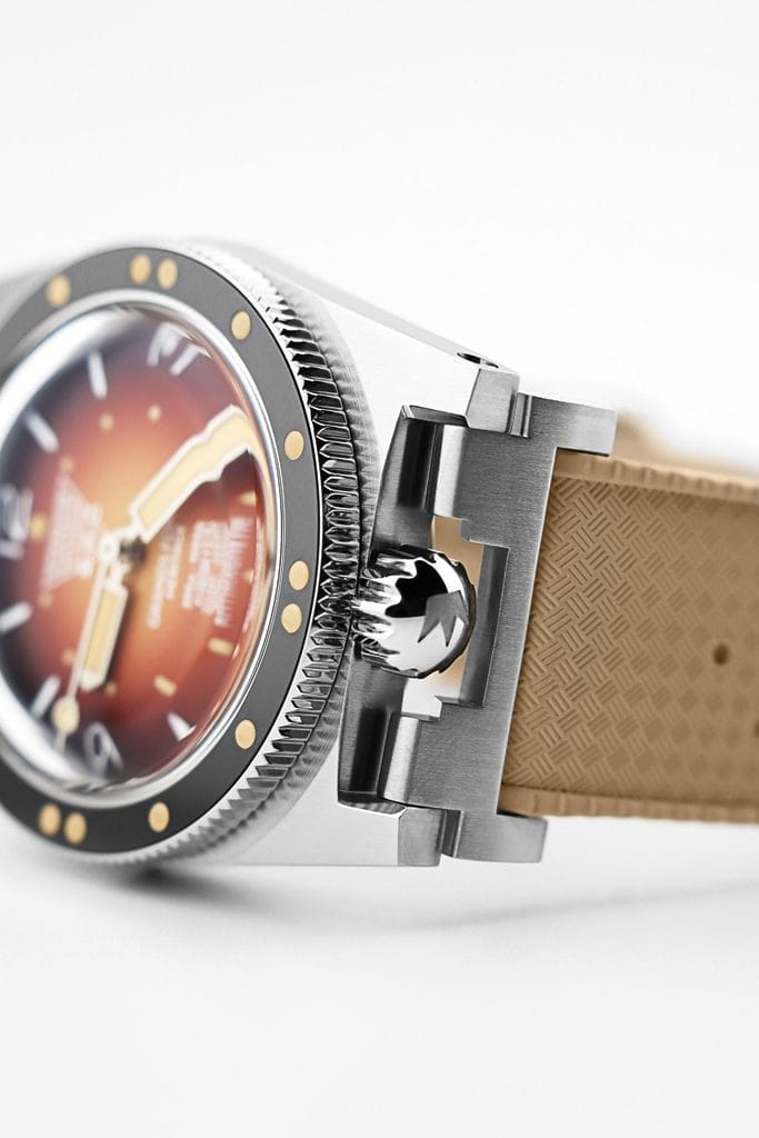 Le bracelet « Tropic » en caoutchouc FKM de teinte sable complète parfaitement cette réédition. Alliant souplesse, résistance et esthétique rétro, il fait écho au cadran et renforce l’harmonie entre les codes du passé et les exigences contemporaines.