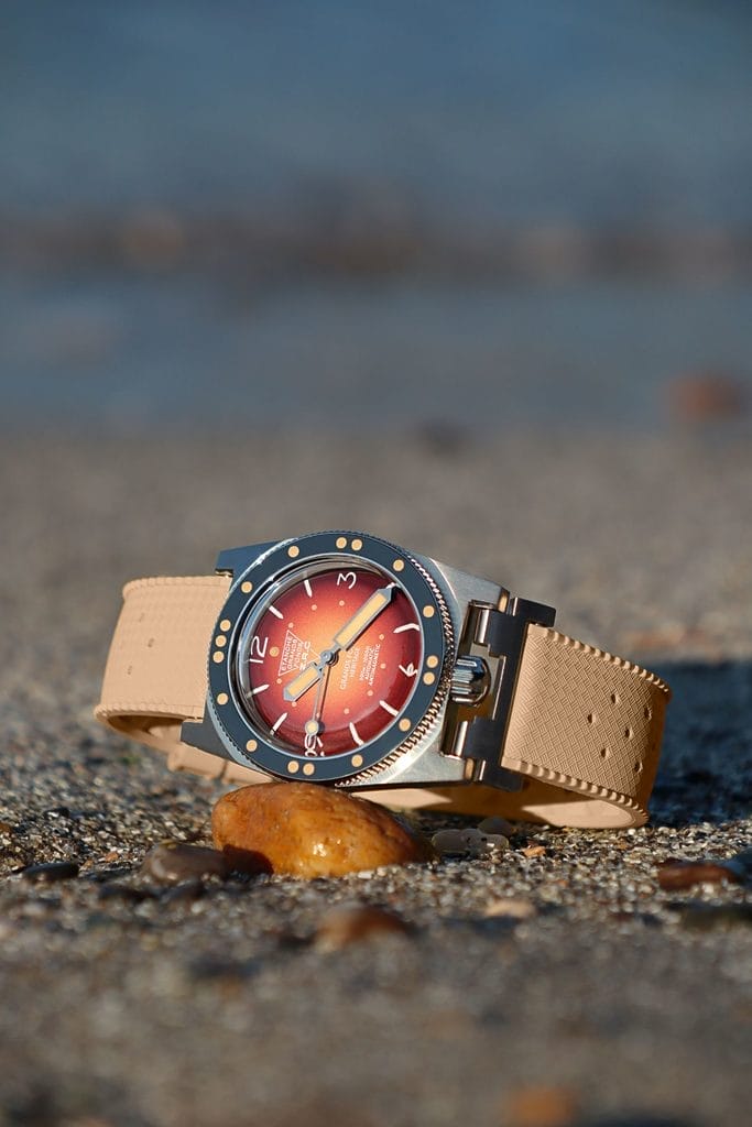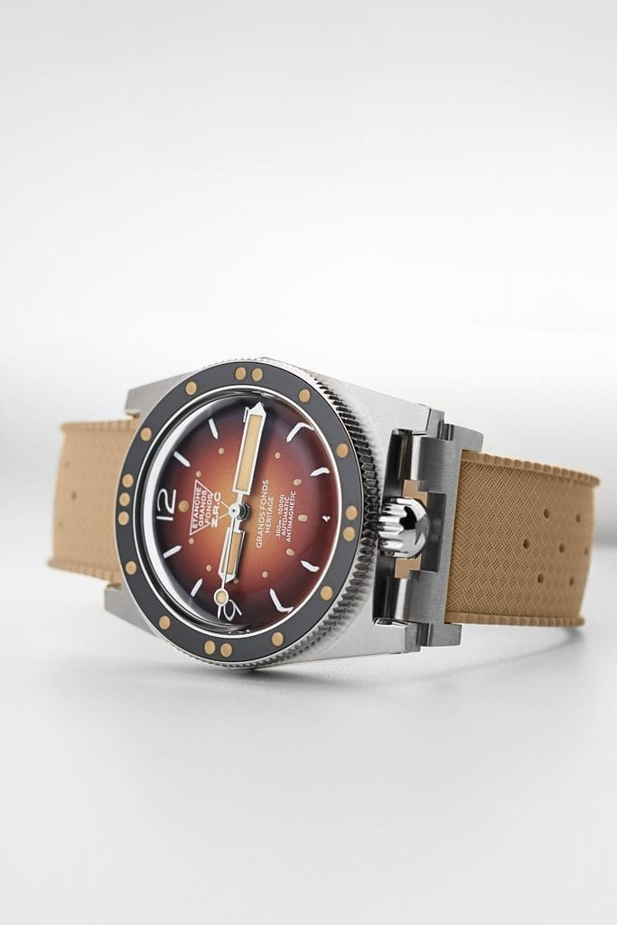 Le bracelet « Tropic » en caoutchouc FKM de teinte sable complète parfaitement cette réédition. Alliant souplesse, résistance et esthétique rétro, il fait écho au cadran et renforce l’harmonie entre les codes du passé et les exigences contemporaines.